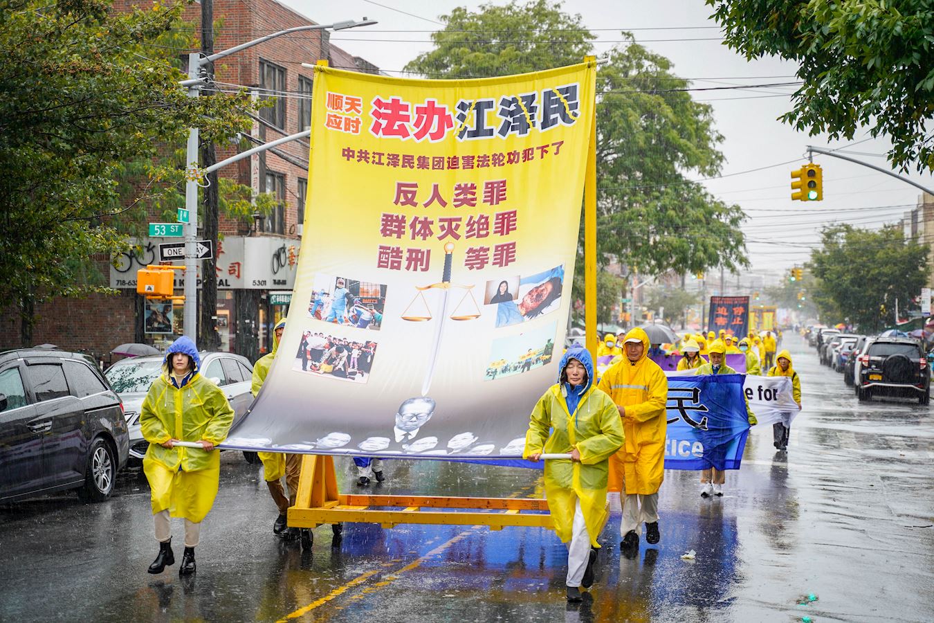 图1~16:二零二二年十月二日,纽约法轮功学员冒雨传递真相。图为游行队伍。 |