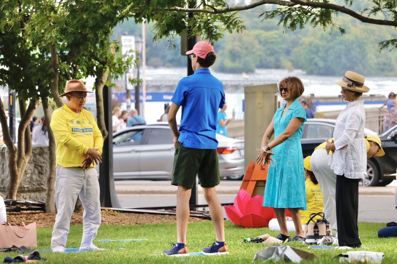 来自纽约的摄影师莫妮卡(Monica)在炼功点很投入的学炼了五套功法。她说:“我是昨天从纽约坐旅游团的巴士过来多伦多的,近十个小时的旅途已经很疲劳了。今天来到大瀑布,好像一个力量带着我来到了这里。一边学功,一边感觉身体异常轻松,一边发自心底的想要大哭。”等炼完第二套功法抱轮后,她自己已经流下了两行热泪。
