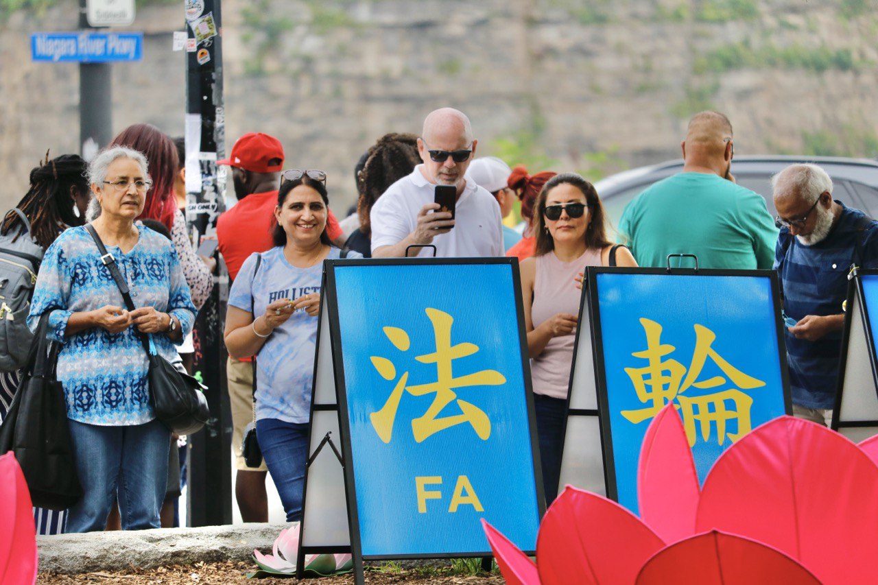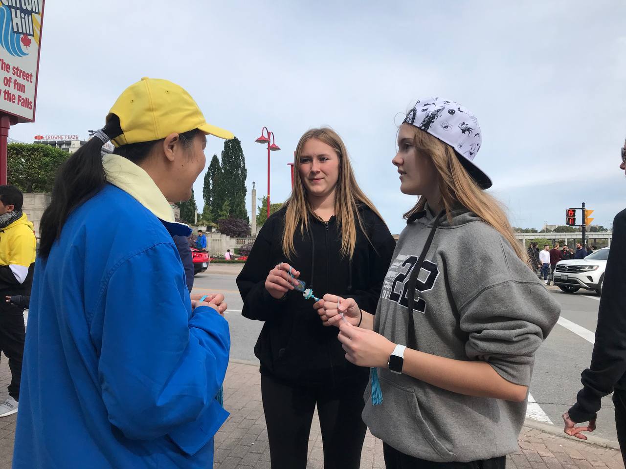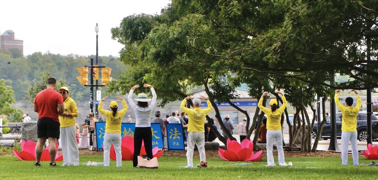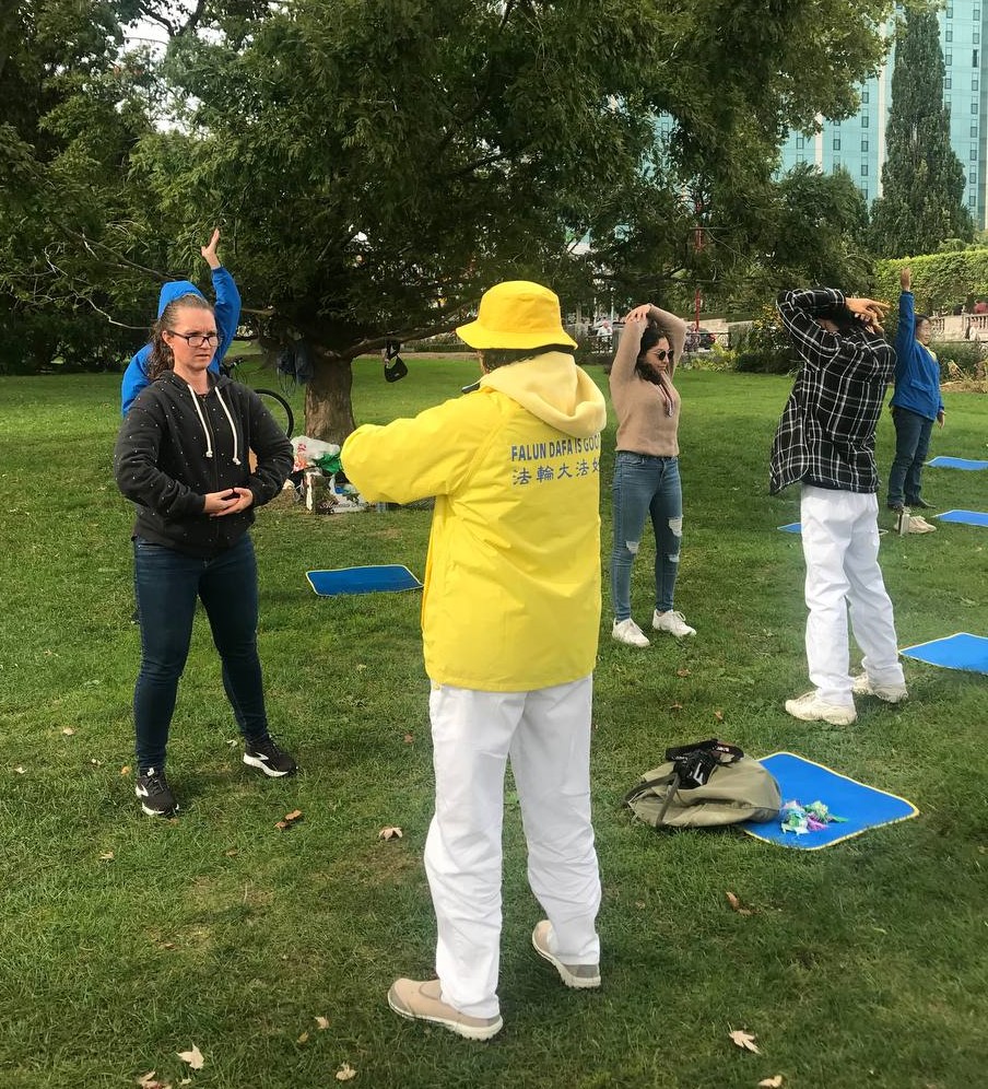 居住在大瀑布的特蕾西女士(Tracy)是一位营养师和饮食搭配指导师。一天她感觉心情低落,就出来散步。当经过现场时被舒缓的音乐所吸引,就驻足观看功法展示,并仔细阅读展板上关于法轮大法简介。