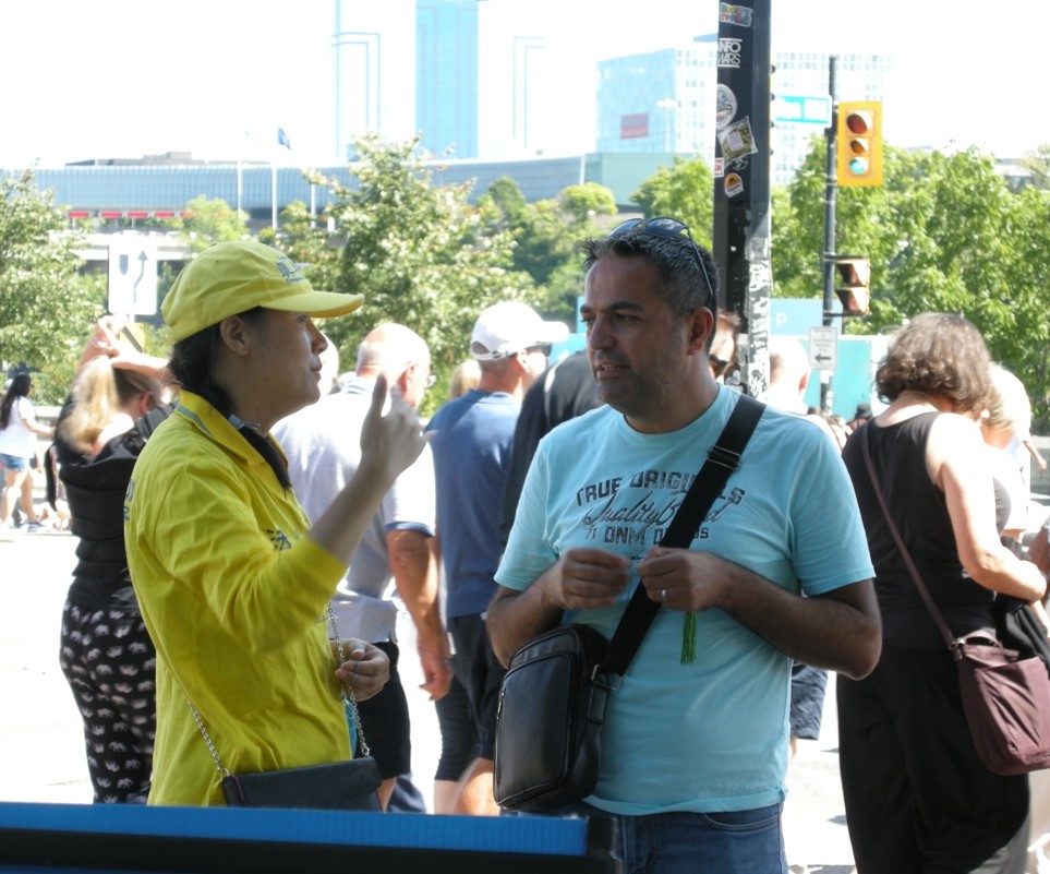 托马斯·恩达伊拉吉耶先生(Thomas Ndayiragige)是来自于渥太华的人权活动家(Human rights activist),一天他和儿子利亚姆(Liam)到尼亚加拉大瀑布来游玩并一起观看了法轮功学员的现场教功。