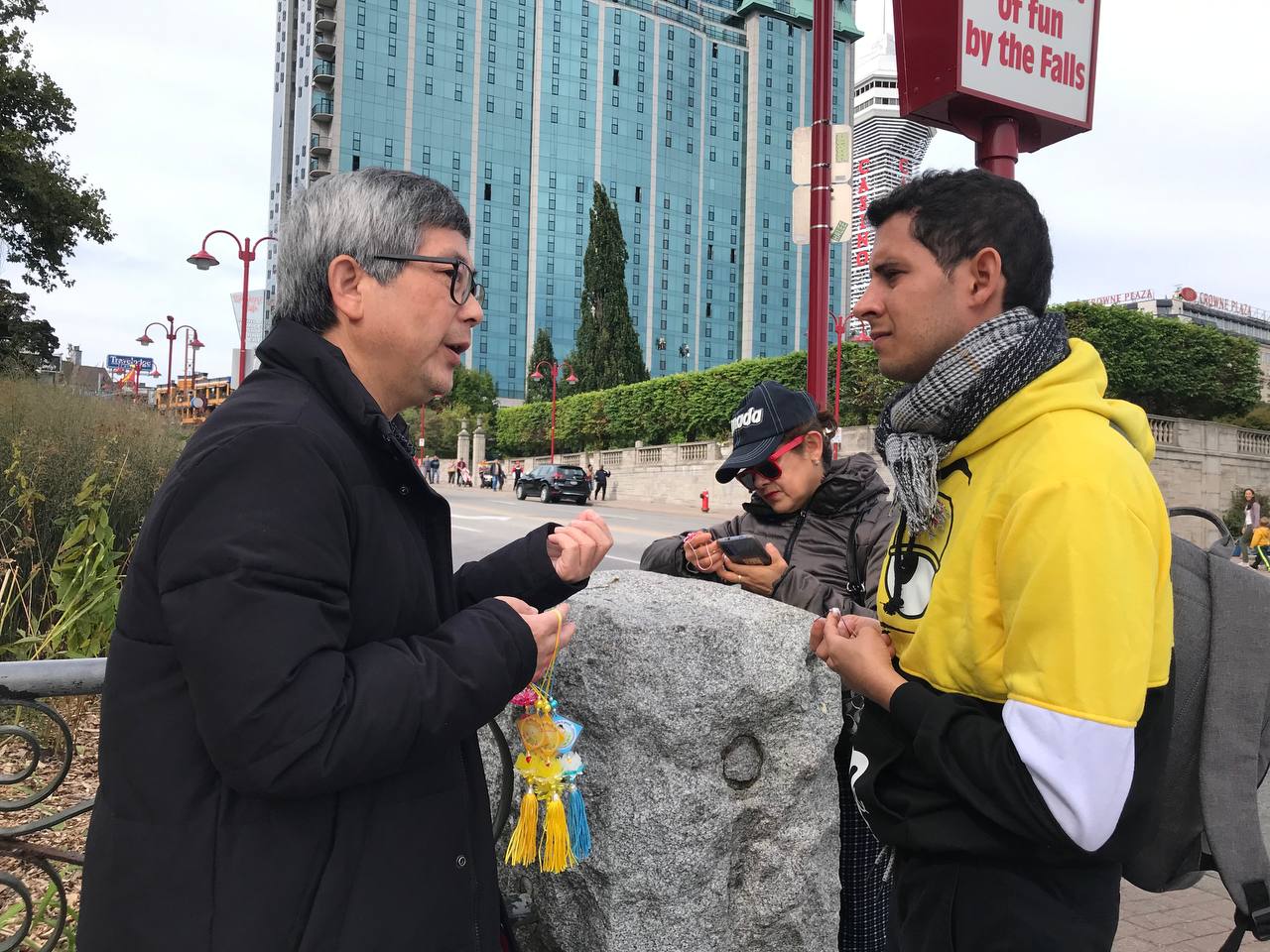 ![]() 图4:路过的年轻人听完真相后开心地和法轮功学员合影 |