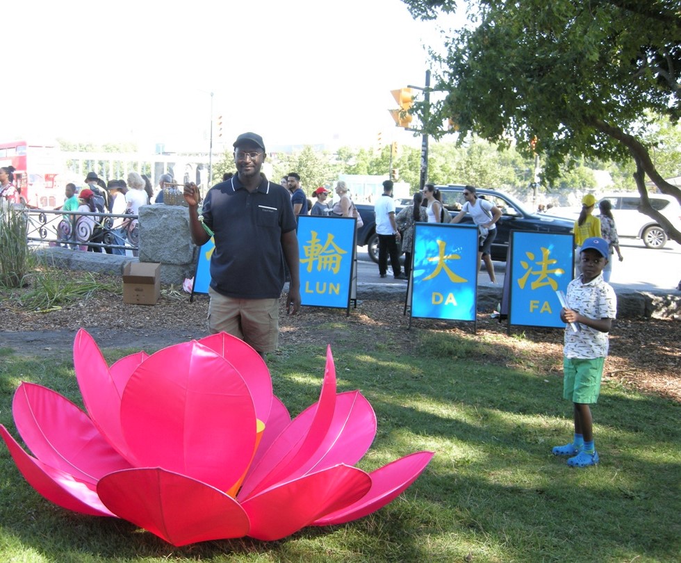 他说:“在这里看到法轮功学员的展位,看到法轮功学员制作的美丽的莲花,看到他们在这里炼功,并向这里的所有人发放出正能量,我感到非常高兴。”
