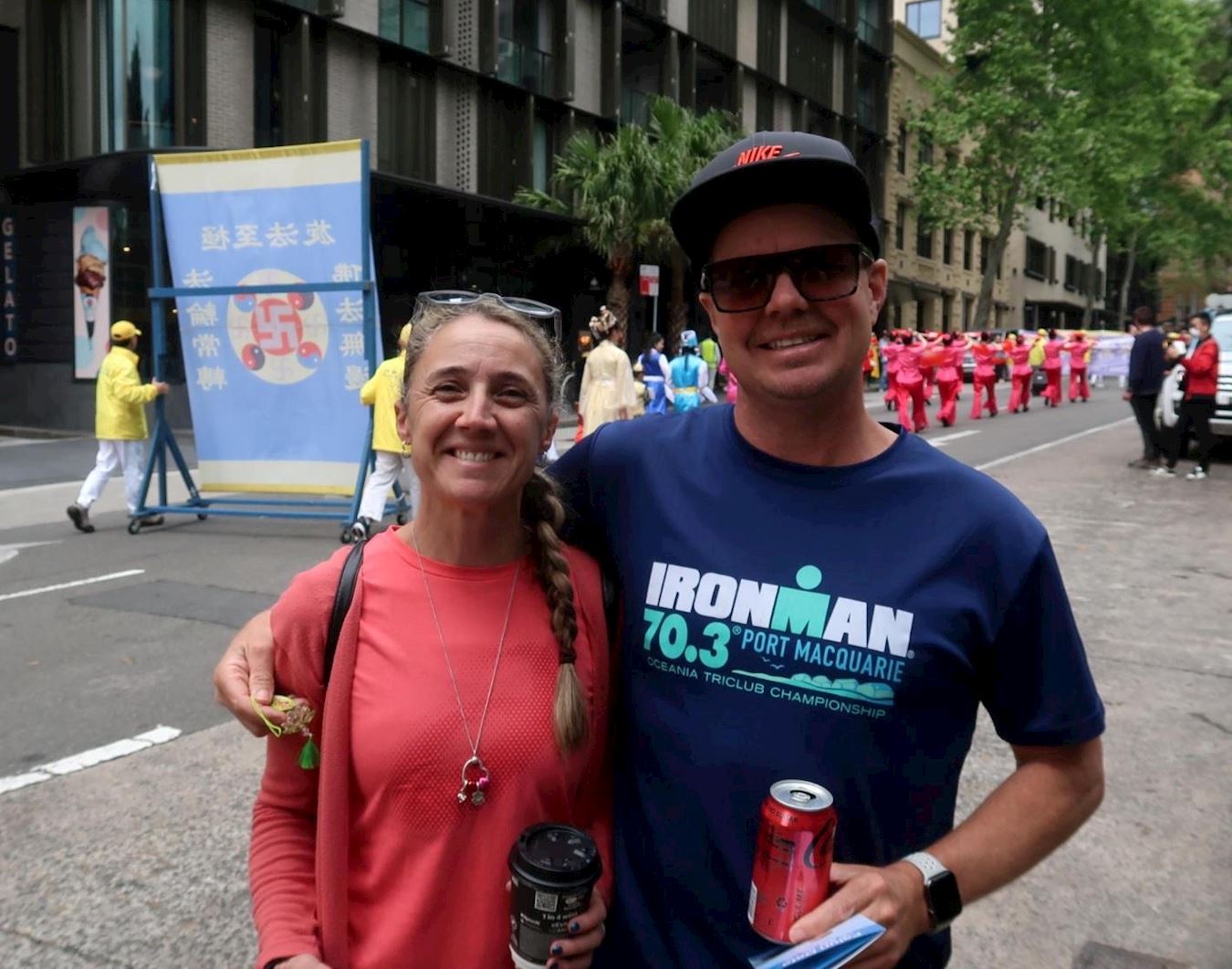 丹(Dan)和西蒙尼(Simone)被法轮功学员游行队伍的鲜艳色彩所吸引。