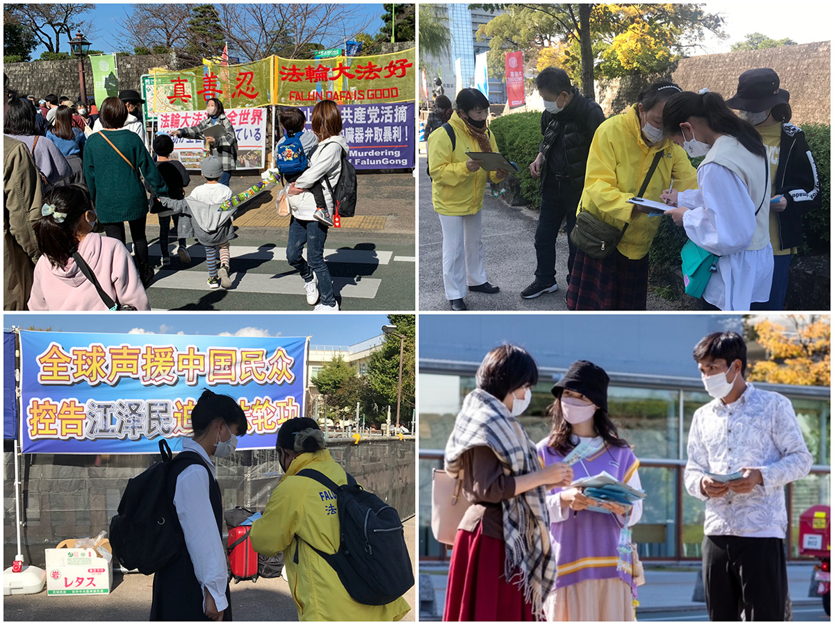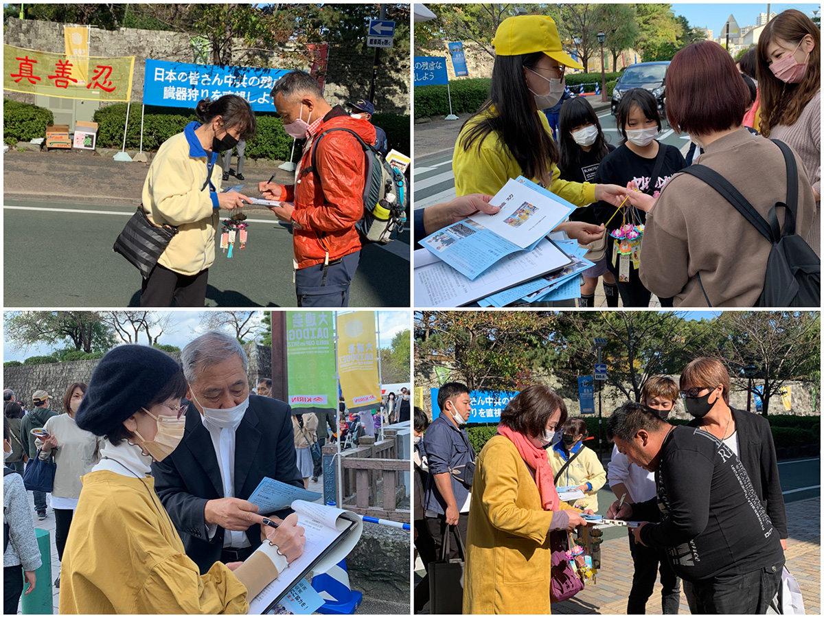 东京、大阪、名古屋、广岛、仙台和静冈当地的部分法轮功学员,也来到活动现场,向日本民众传播法轮功真相,弘扬大法美好,并征集“制止中共活摘法轮功学员器官、法办迫害元凶江泽民”的签名。