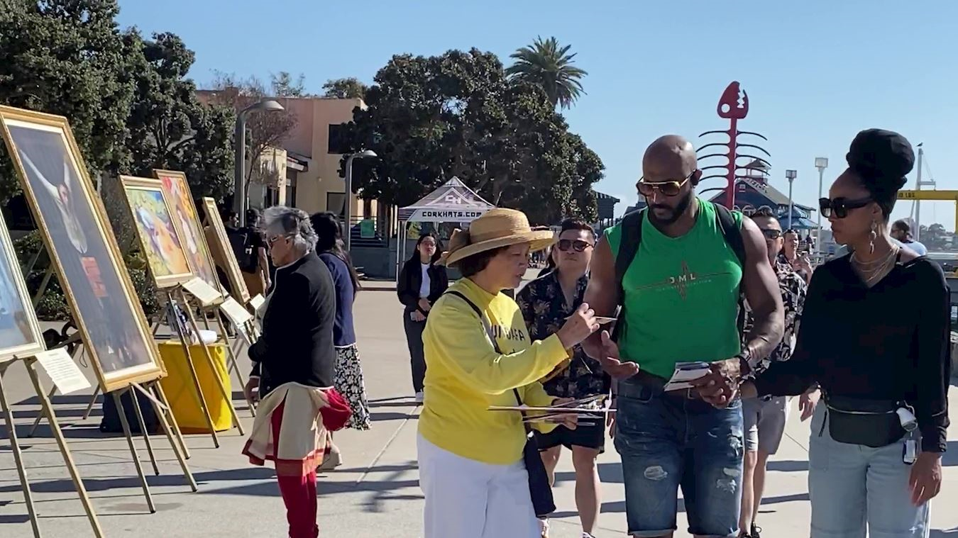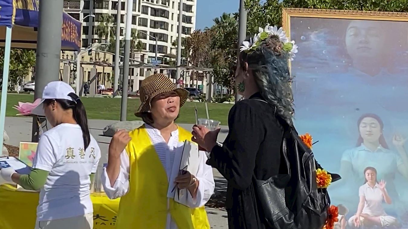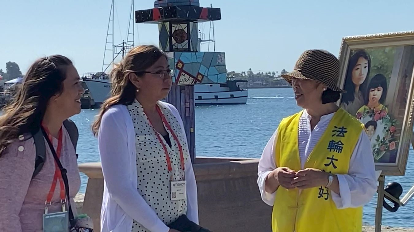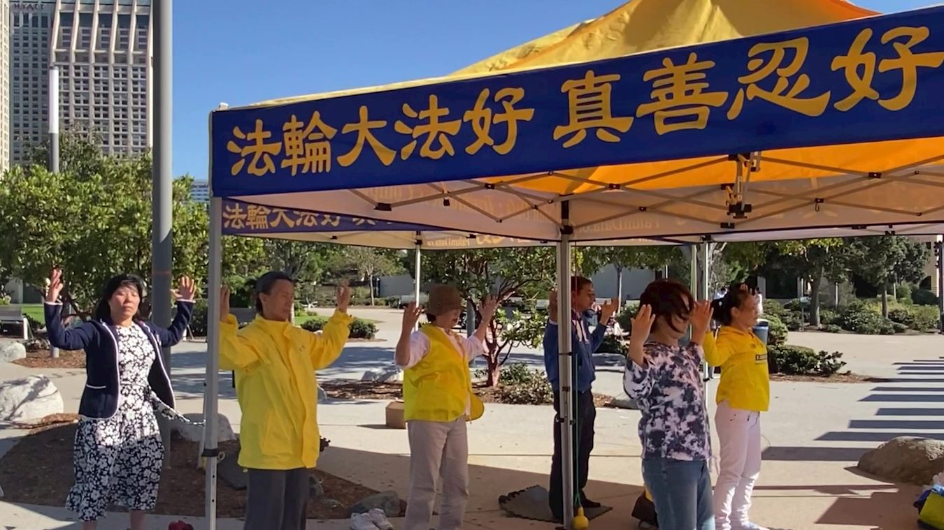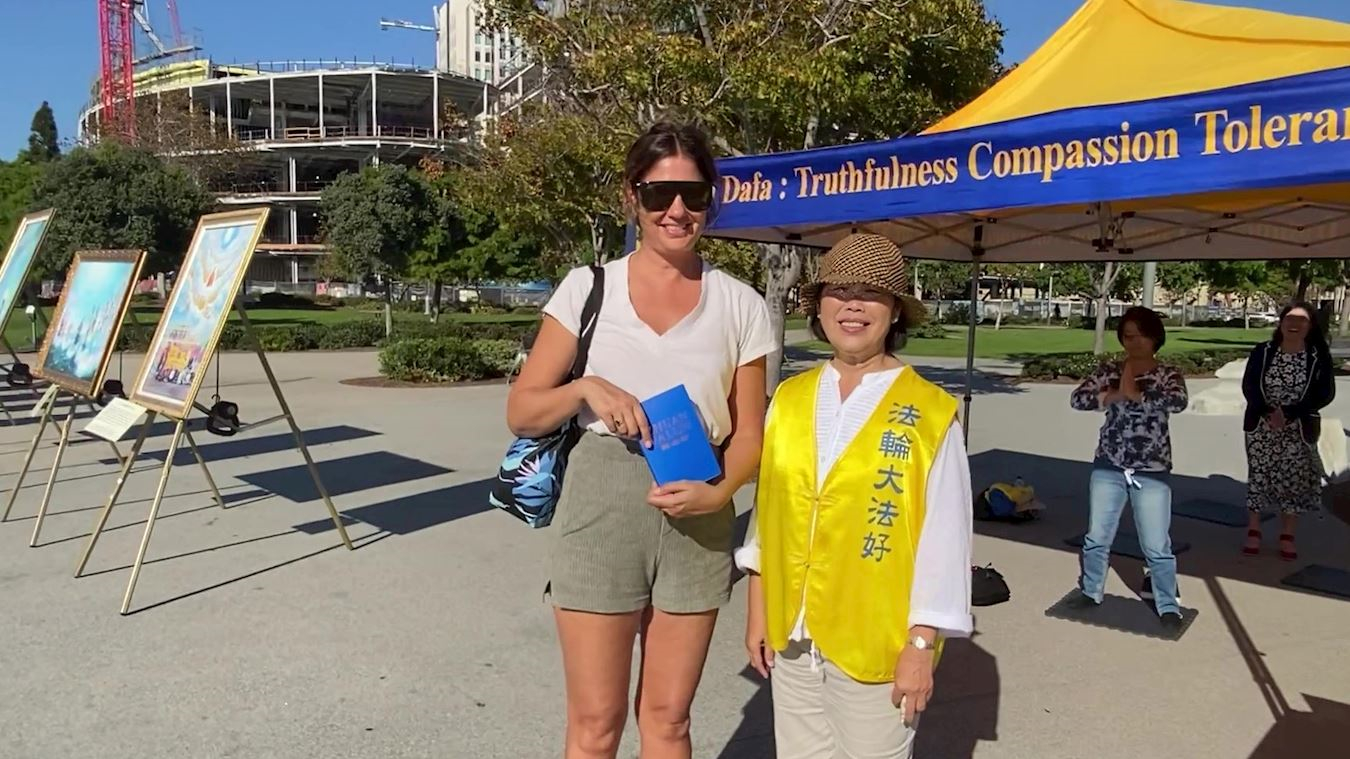 罗珊娜(Roxanna)是圣地亚哥的艺术家,她上班途中经过公园观看了真善忍画展很受触动,主动签名支持法轮功反迫害。当看到法轮功舒缓、祥和、优美的功法演示后,罗珊娜(Roxanna)问了学员们炼功的地点,还表示她第二天不上班,一定要去那儿学炼这五套功法。