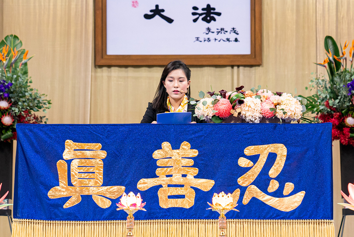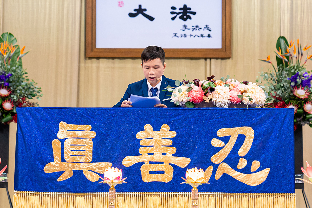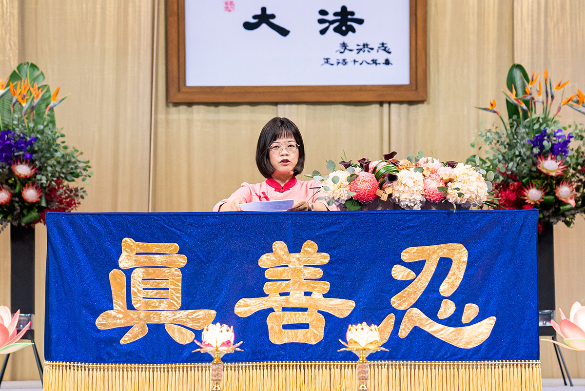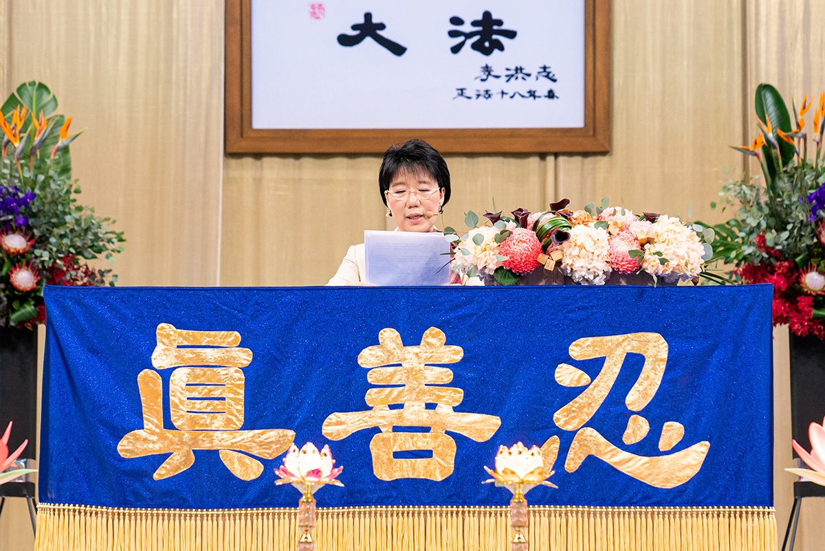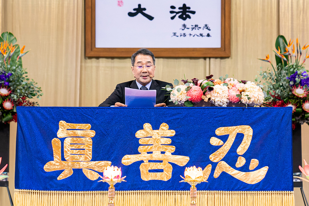 主席台正中央高挂李洪志师父法像与“真善忍”、“法轮常转”两面法轮图形;师尊词句“慈悲能溶天地春 正念可救世中人”[1]高悬两侧,多面印着《洪吟》中的诗词横幅环绕全场,会场气氛殊胜庄严。这次法会共有十九位学员发言,交流他们在修炼中内找自己、实修心性、用心救人的体悟,深深触动每一位在场的学员。