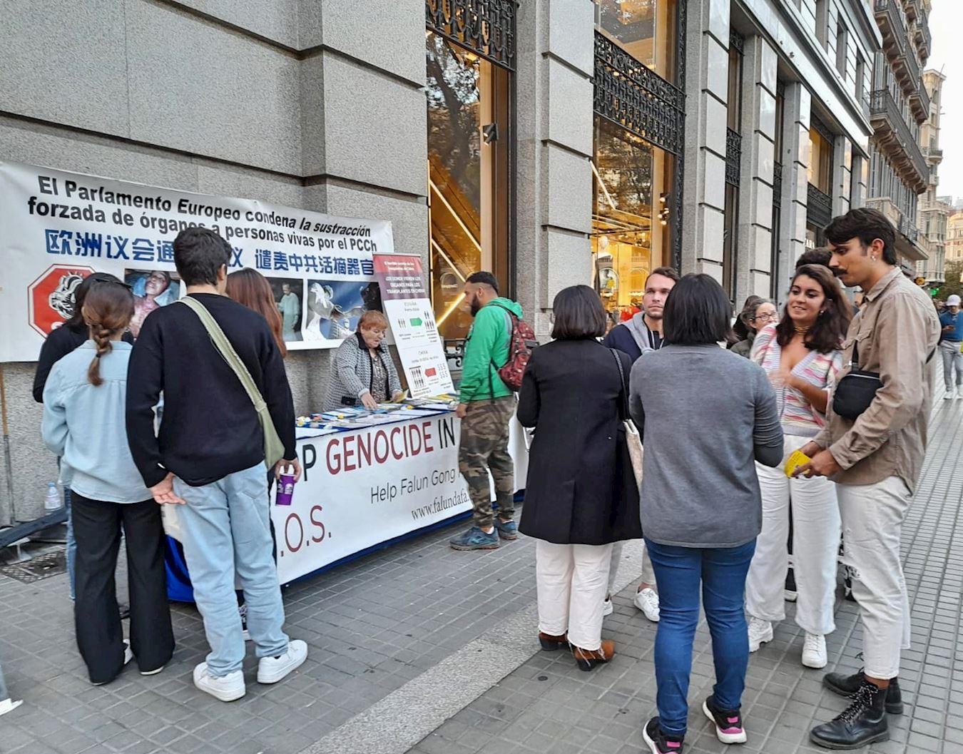 当天,法轮功学员在人群熙攘的流浪者大街上设立了真相点。在真相点现场,悠扬的《普度》、《济世》音乐,一条巨幅横幅格外醒目,上面用中西文写着:“欧洲议会通过决议,谴责中共活摘器官”,吸引了很多过往行人驻足观看,了解真相,签名支持法轮功学员和平反迫害。