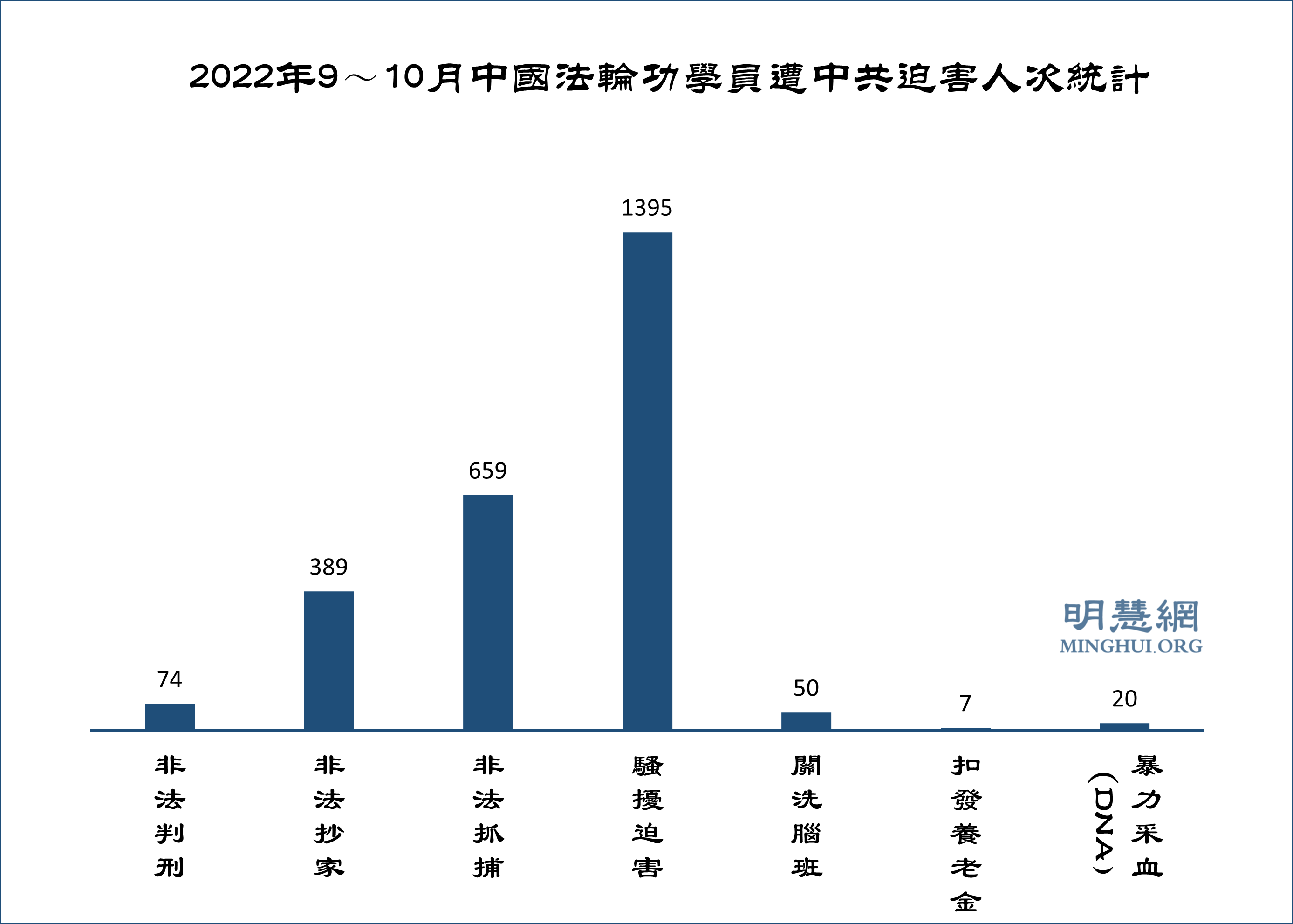 ![]() 图1:2022年9~10月中国法轮功学员遭中共迫害人次统计 |