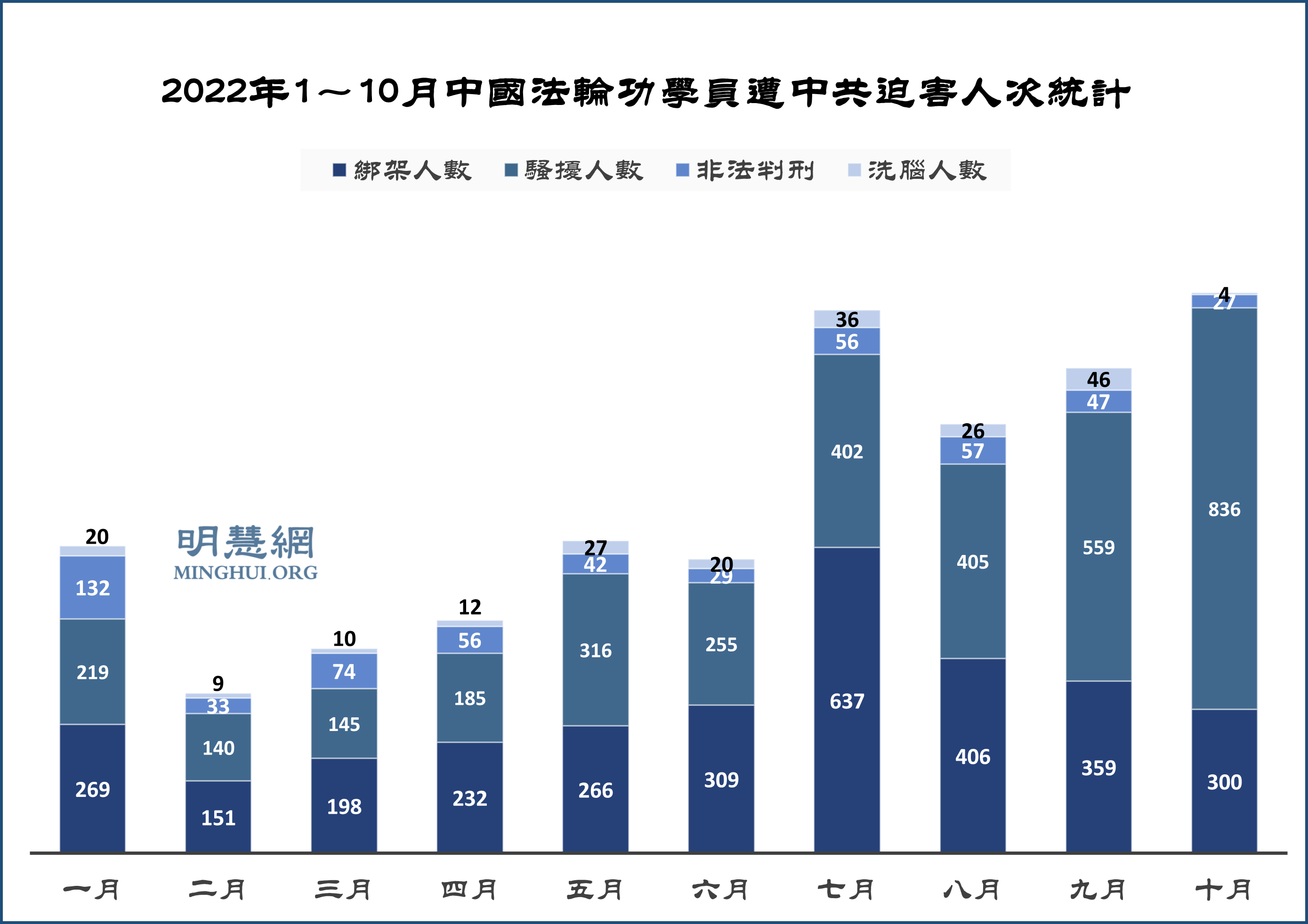 ![]() 图2:2022年1~10月中国法轮功学员遭中共迫害人次统计 |