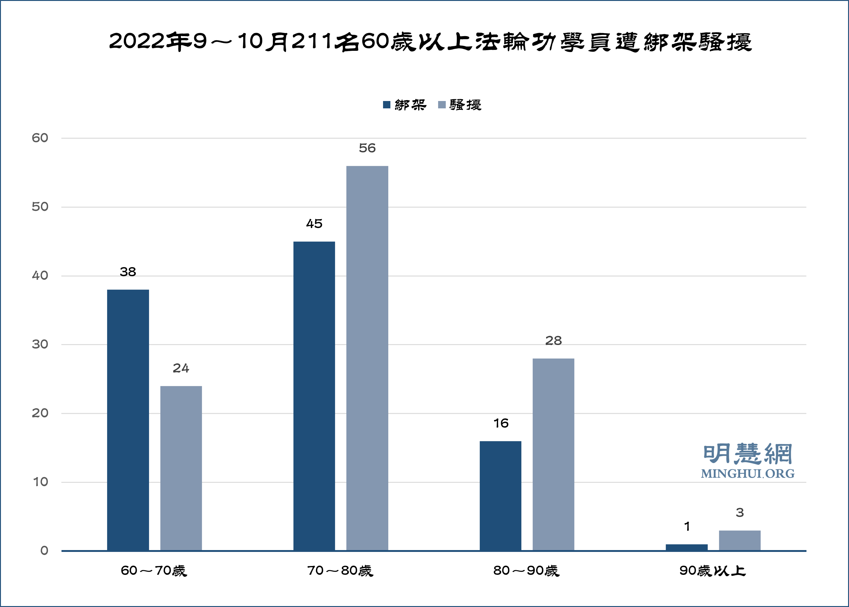 ![]() 图4:2022年9~10月211名60岁以上法轮功学员遭绑架骚扰 |