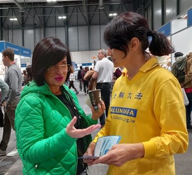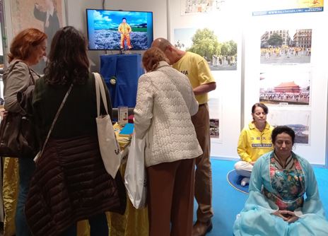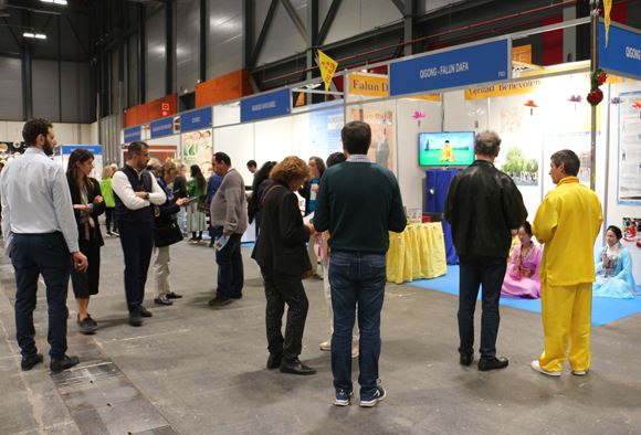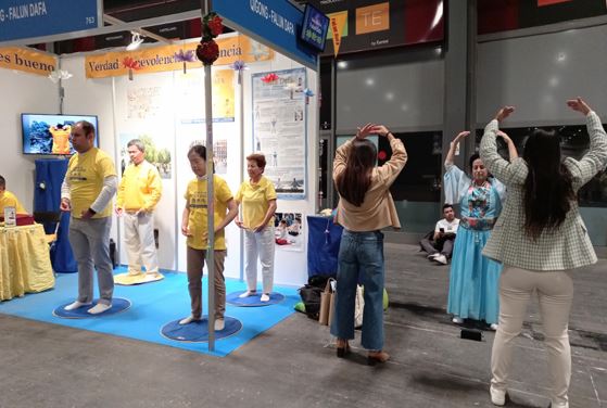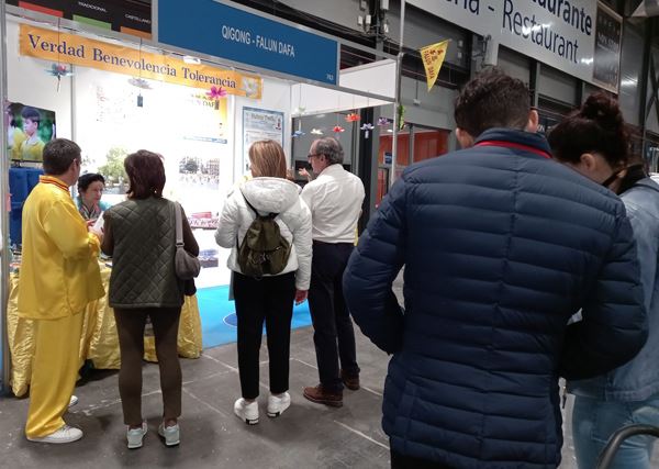 展会期间发生了许多令人感动的故事:一位女士和学员交谈后的第二天,把她的母亲、先生和儿女全家都带到了展位学炼功法。她表示:法轮大法非同寻常,能在这里遇到法轮大法感到非常幸运,所以她把全家都带来了。健康展最后一天,一位西班牙王室成员来到法轮大法展位,欣然接受了真相传单和带有真、善、忍卡片的小莲花,连声说:“谢谢!谢谢!”许多参观者很久以前就听说了中共在中国对法轮大法修炼者的迫害,他们对中共的暴行表示愤怒和谴责。一些参观者询问如何可以帮助制止迫害,学员告诉他们可以在征签表上签名、也可以在征签网站上签名制止迫害。有两位老太太结伴而来,当听闻法轮大法的美好以及被中共迫害的真相后表示:“每个有良知的人都应该站出来制止迫害,希望这场悲剧早日结束。”