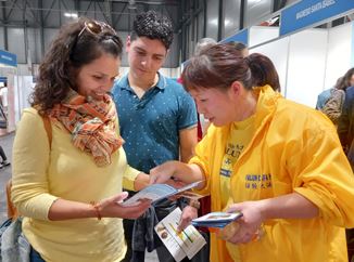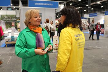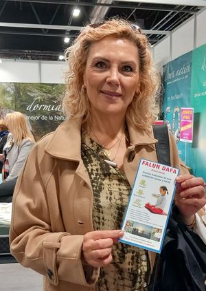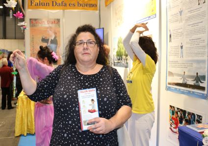 碧拉(Pilar)女士是位教育工作者,她特地从北部城市赶来参加展会。她说她十几年前就在马德里太阳门广场见过法轮功学员的征签活动。法轮功被中共迫害的惨景让她很震惊,她毫不犹豫地签了名。当时她就想学功,但由于所在城市没有炼功点,所以就耽搁下来。这次终于又见到了法轮功,她很高兴,请了《转法轮》,并表示等自己学会后要在学校教孩子们炼功,这么好的功法,一定要让更多的人知道。
