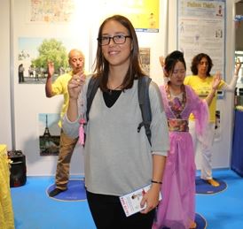 年轻姑娘阿达说:“这个功法太棒了!我花了很长时间看了所有的资讯,也思考了很久。路过你们(法轮大法)的展位时,我感到了巨大的能量。前不久我在之前居住的城市开始练另一种气功。我觉得今天我在这里不是巧合。碰到你们一定有其原因,虽然我说不清楚具体是什么原因,好像有一种力量指引我来到这里。”