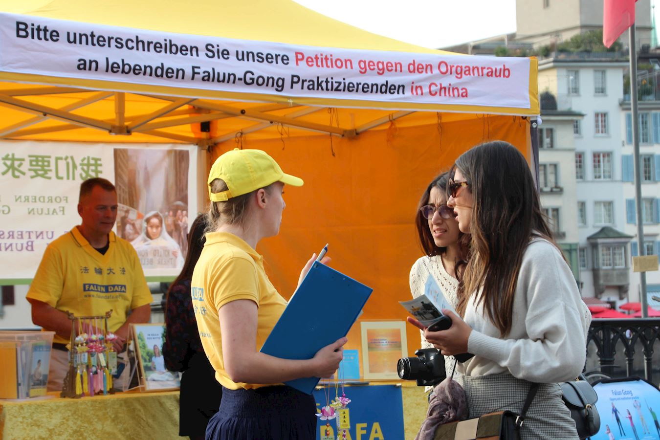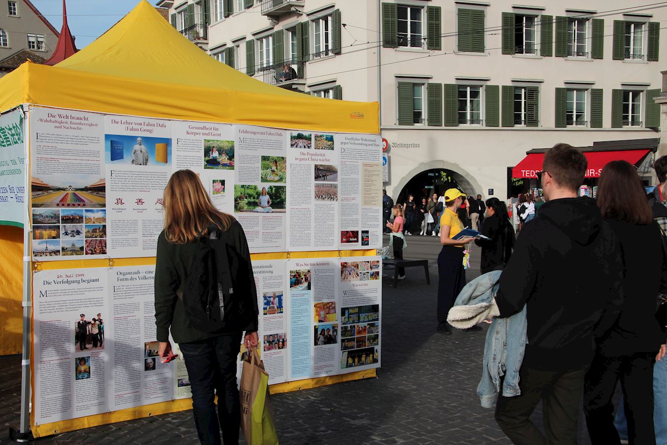 二零二二年十月二十九日,瑞士法轮功学员在苏黎世(Zurich)利马特河畔(Limmatquai)举办信息日,传播法轮功的真相。