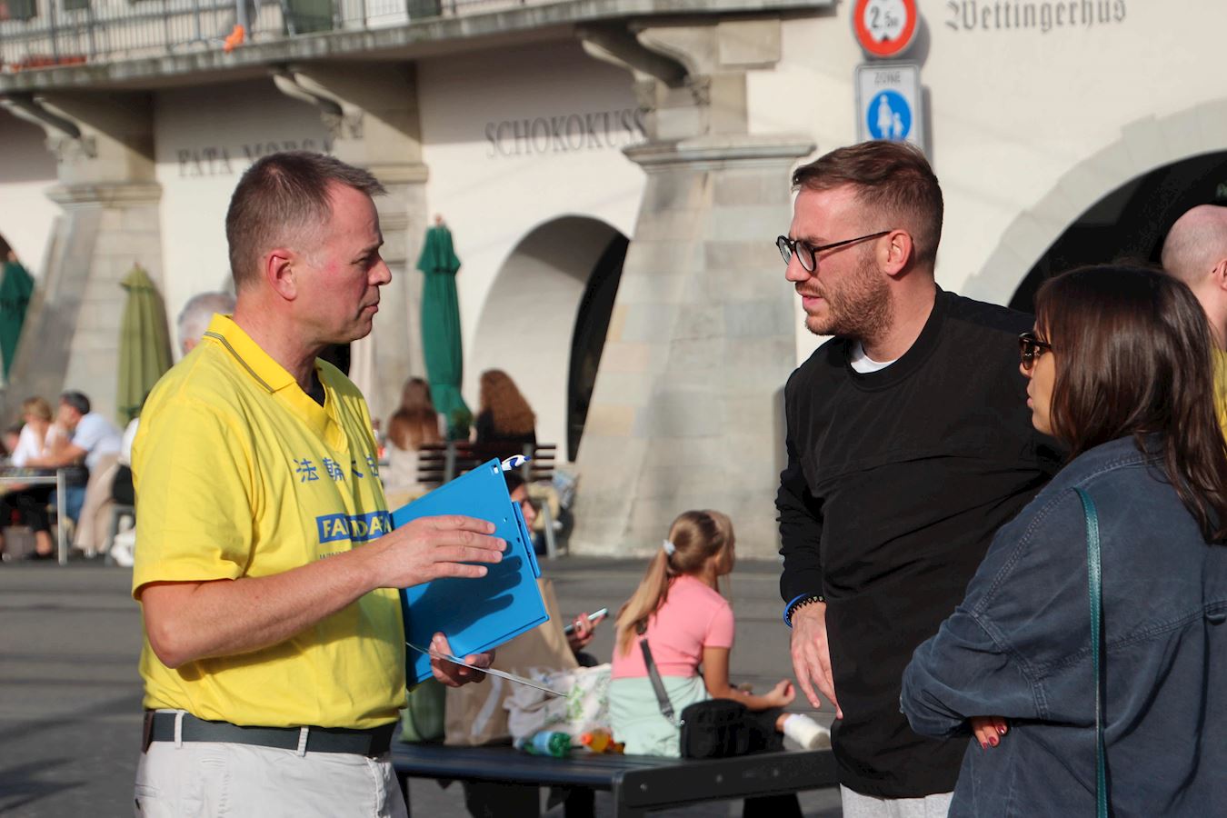 在建筑业任职了十多年的法比奥·埃尔南德斯(Fabio Hernandez)因为看到法轮功学员在打坐而停下了脚步。在他听完学员的介绍后,他立即签名支持法轮功学员,他还希望:“这里所有的人都能来签名,以便让征签表能够递交给瑞士联邦政府,让他们看到这些诉求,采取行动。”