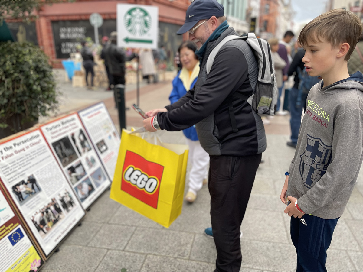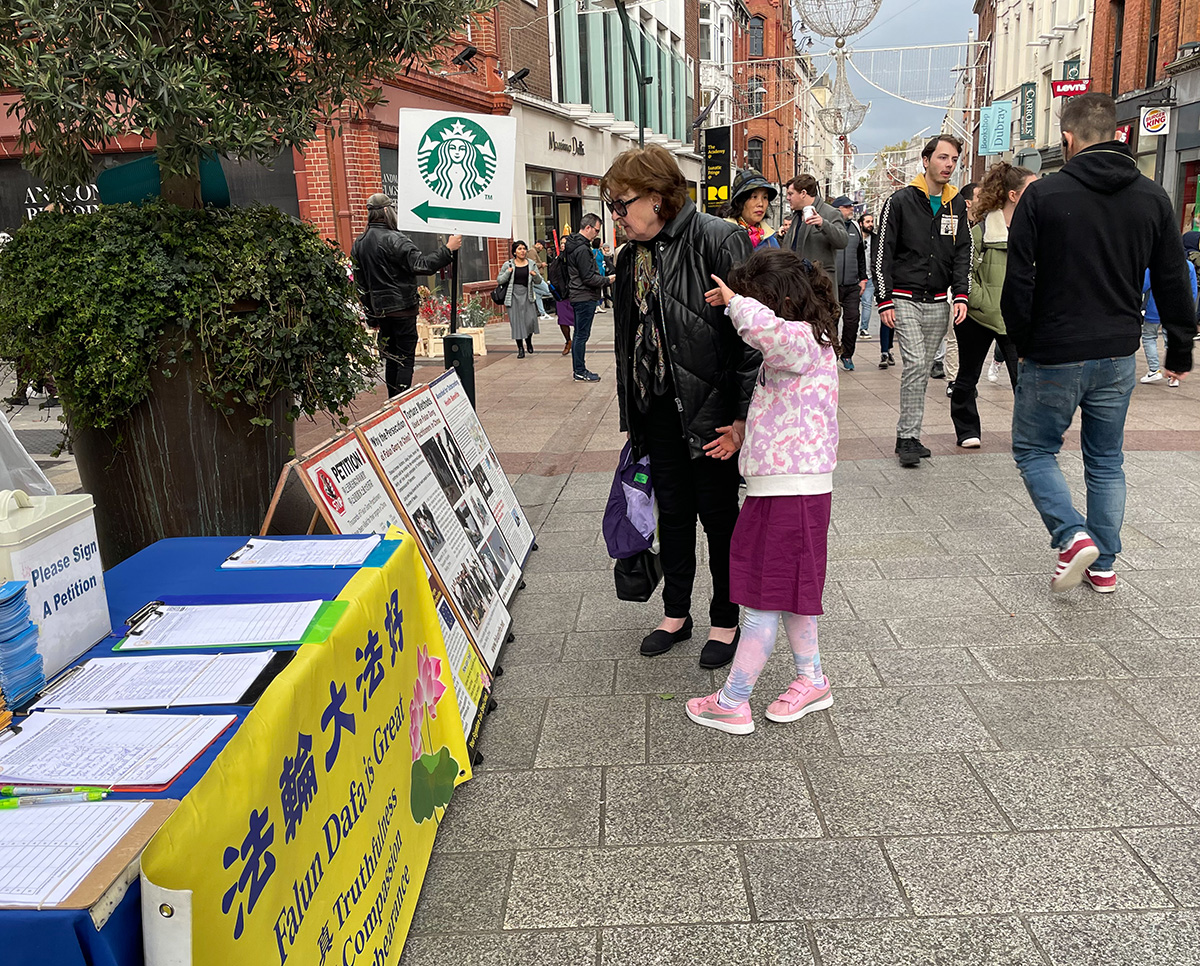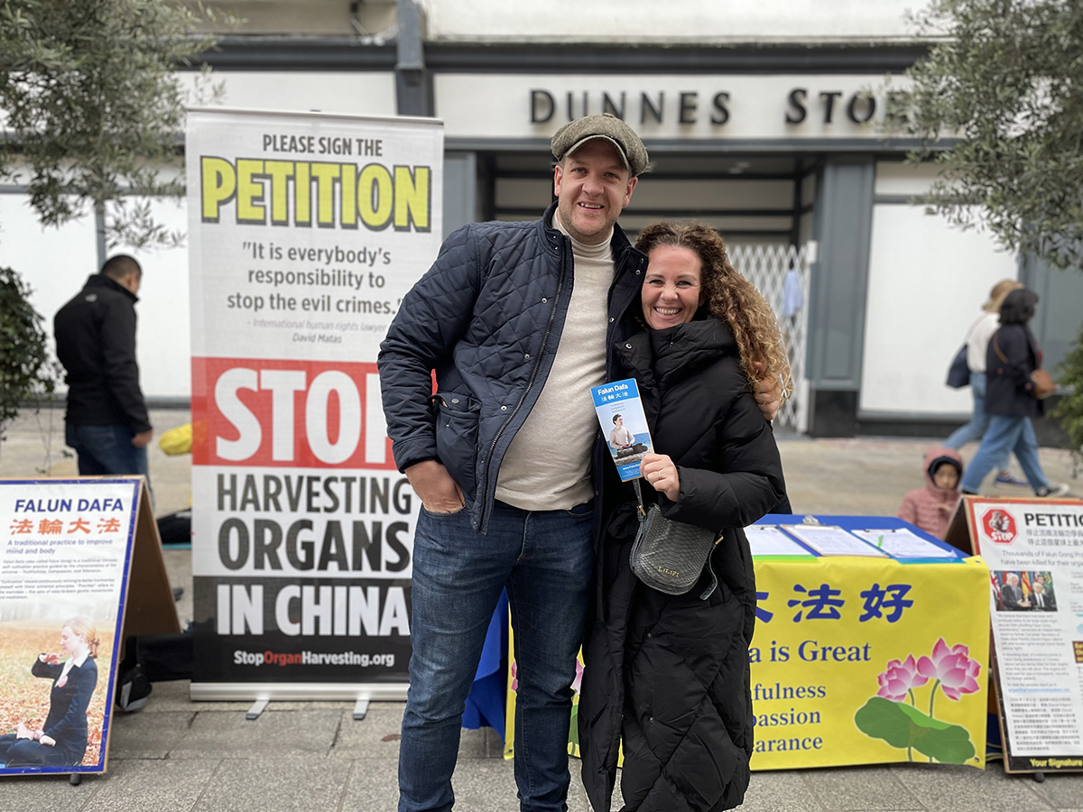来自伦敦的丽萨(Lisa)和乔伊(Joe)周末来爱尔兰旅游。看到这里也有法轮功真相点,他们感到很吃惊。他们说每每路过伦敦的中领馆,总能看到法轮功学员坚守的身影。他们认为法轮功学员做的这件事很重要,“你们不仅(告诉了世界在中国的)法轮功学员的承受,你们也让欧洲明白了(所面临的)危险:中共正在渗透社会的每个阶层。如果中共能不择手段迫害法轮功、耗费如此巨大的资源与时间迫害真、善、忍普世价值,那将没有人能逃过它的魔爪。”