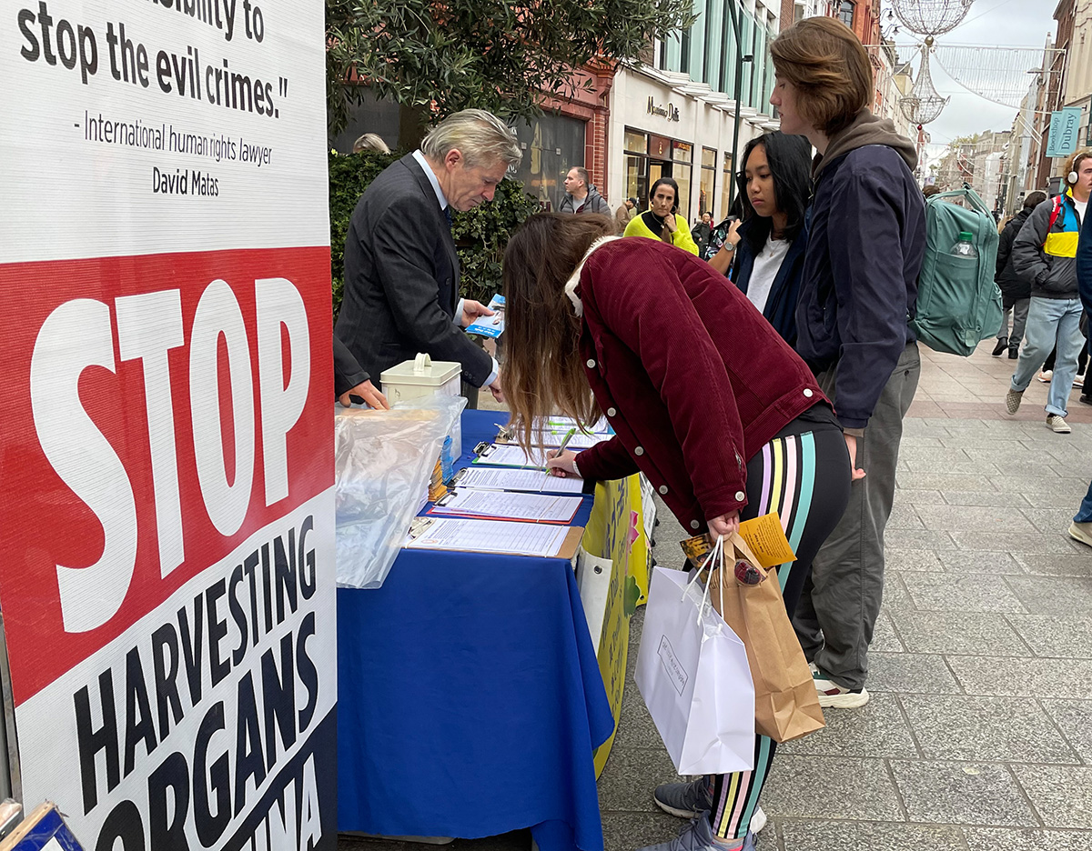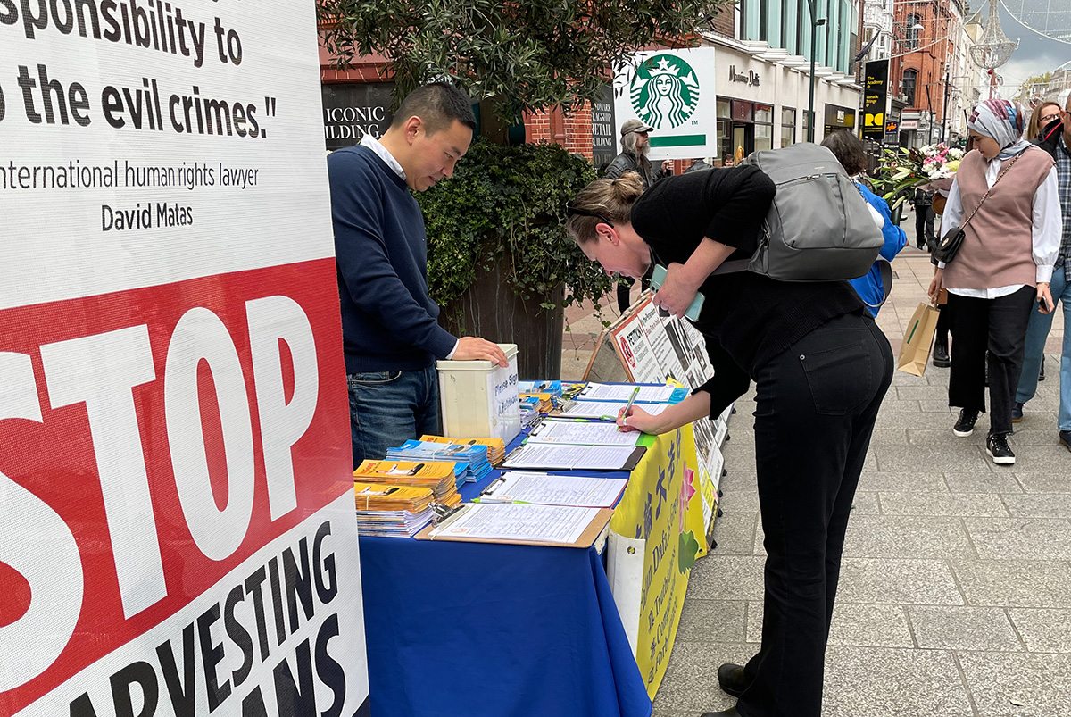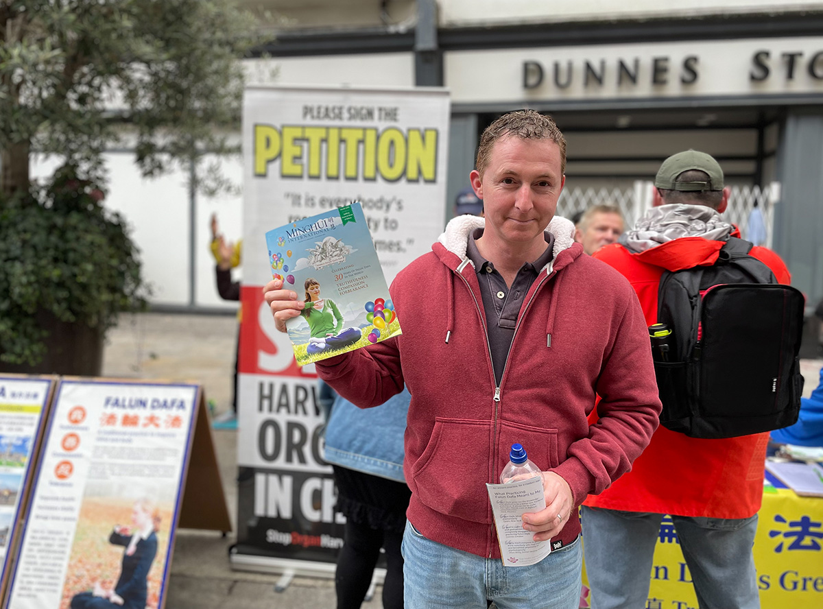 来自伦敦的丽萨(Lisa)和乔伊(Joe)周末来爱尔兰旅游。看到这里也有法轮功真相点,他们感到很吃惊。他们说每每路过伦敦的中领馆,总能看到法轮功学员坚守的身影。他们认为法轮功学员做的这件事很重要,“你们不仅(告诉了世界在中国的)法轮功学员的承受,你们也让欧洲明白了(所面临的)危险:中共正在渗透社会的每个阶层。如果中共能不择手段迫害法轮功、耗费如此巨大的资源与时间迫害真、善、忍普世价值,那将没有人能逃过它的魔爪。”