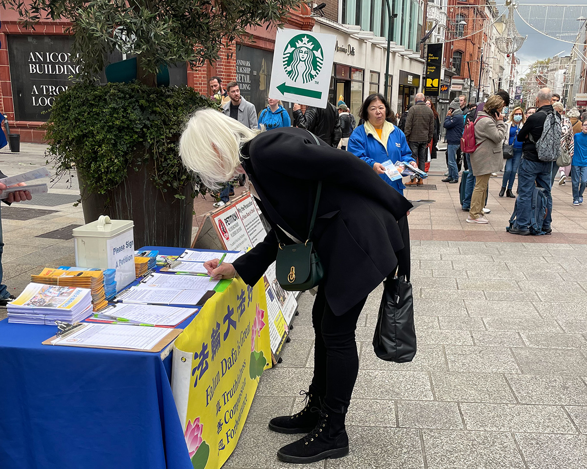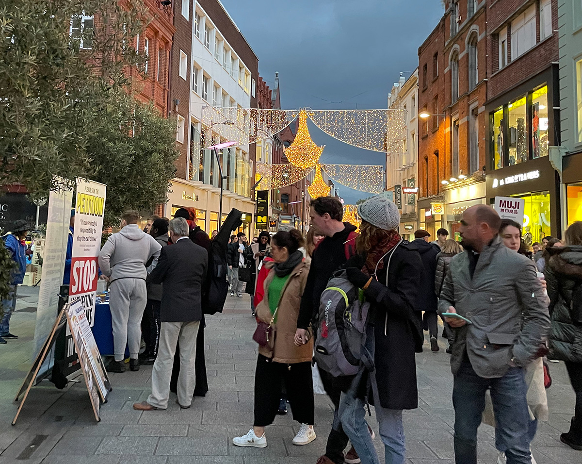 熙熙攘攘的街头,法轮功学员宁静祥和的炼功场面已成为格拉夫顿大街上的常景。这条蜿蜒曲折的巷道曾一度连都柏林人都不愿踏足,但三百年后的今天,格拉夫顿大街已经成为爱尔兰首都的地标,每年数以百万的游客从世界各地来到这里购物观光。