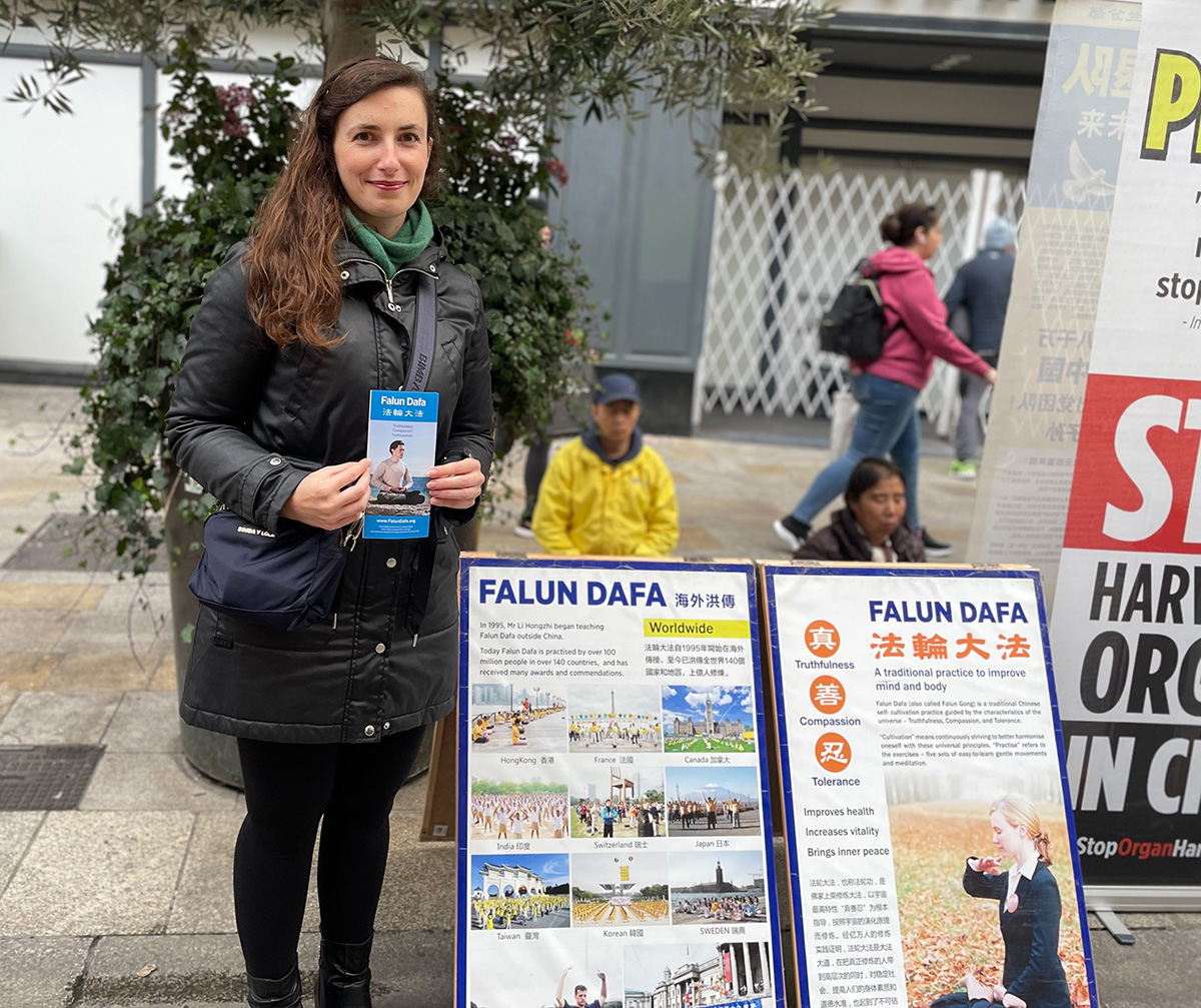 一位年轻中国女士正要去旁边的商店购物,看到学员递过来的真相小册子,她便打开了话匣子。她说,“法轮功真是太伟大了,你们能为中国人发声”。她告诉学员说自己来自四川,曾听说过王立军事件,学员对她说王立军和那些落马的中共高官都曾跟随恶首江泽民迫害、活摘法轮功学员器官,告诉她所谓的天安门自焚其实是中共自导自演的骗局。