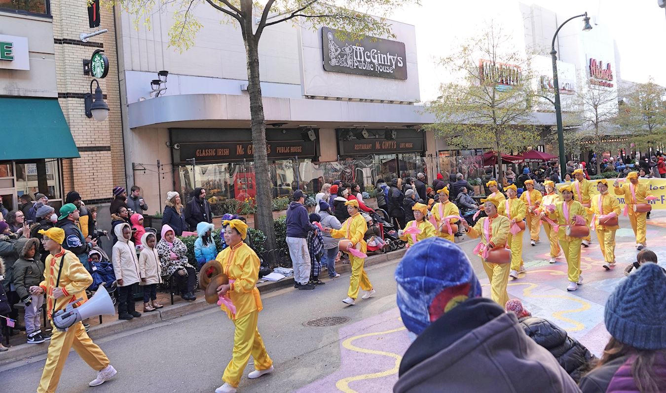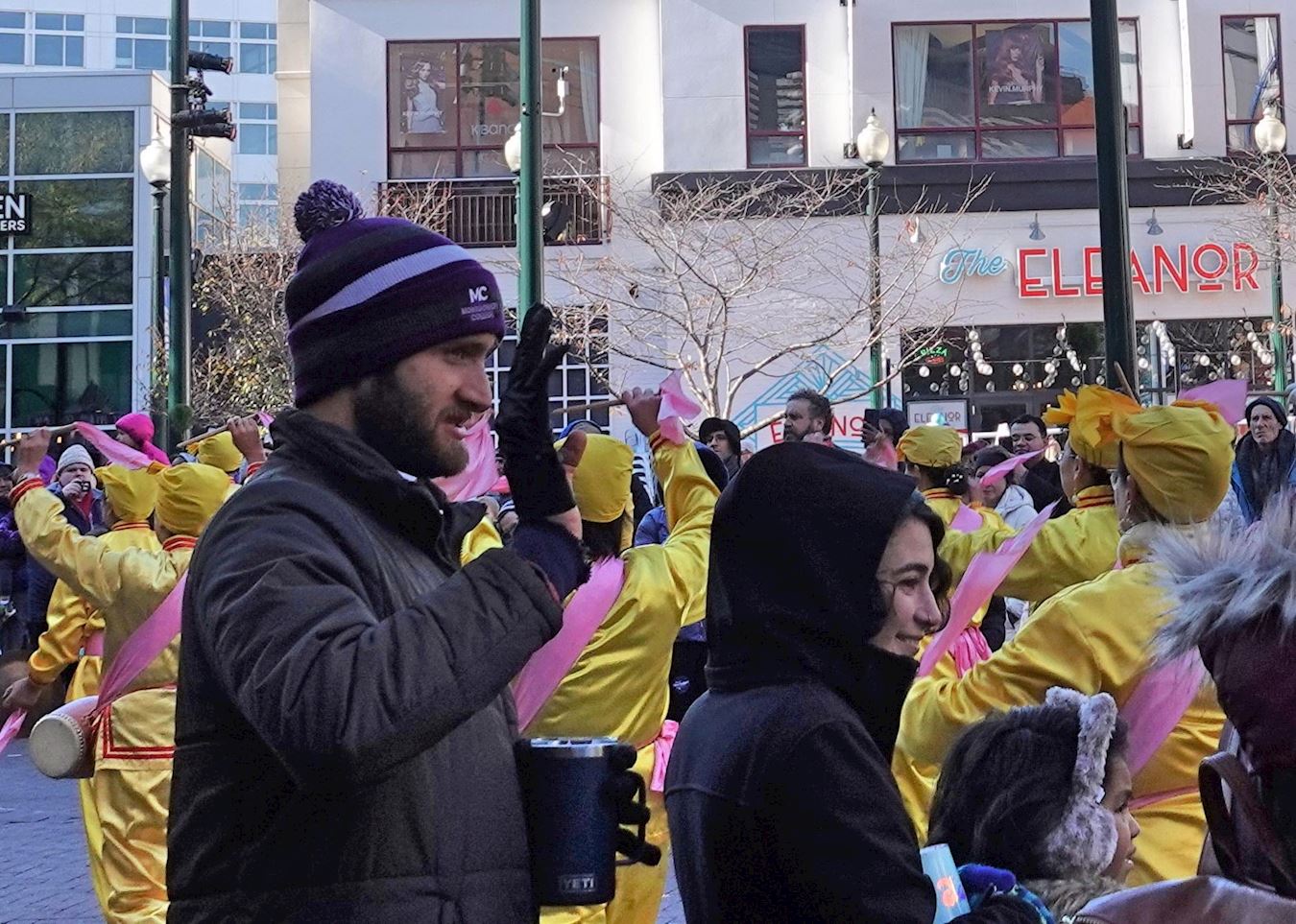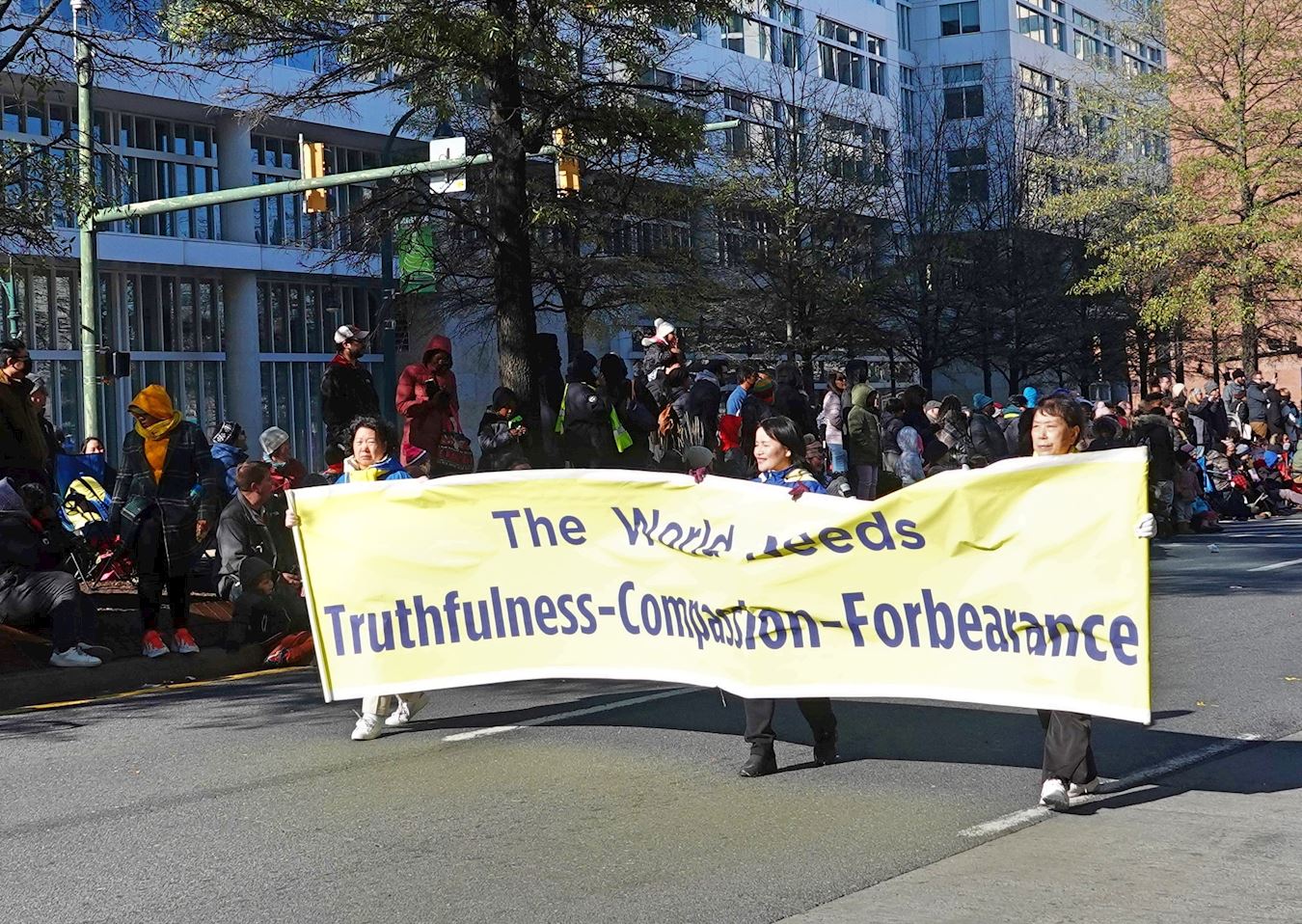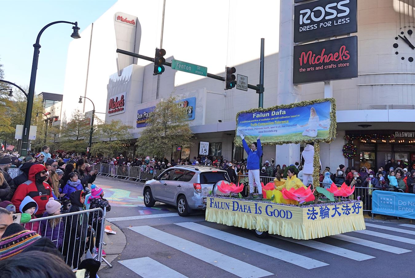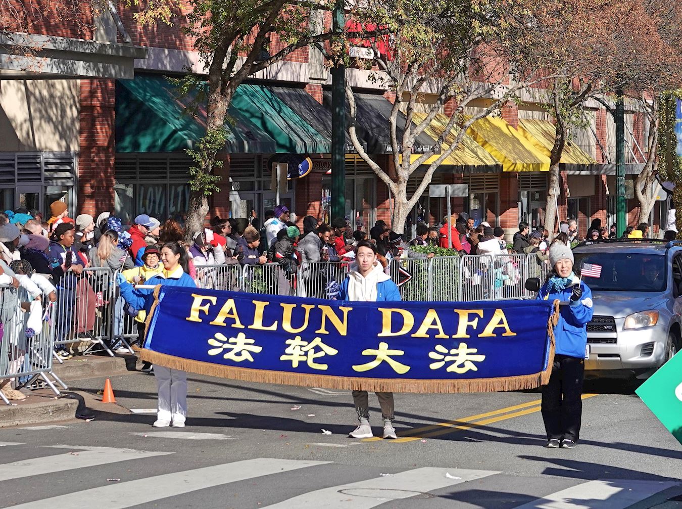 这是大华府地区唯一的感恩节游行庆祝活动,吸引了来自周边地区的各族裔民众。当天有一百五十多个队伍参加了游行。法轮功学员游行队伍包括花车和腰鼓队,几位青年法轮功学员在花车上演示五套功法。腰鼓队伴着《法轮大法好》的歌曲,带给民众平和与喜庆,人们伴随着鼓点为他们鼓掌喝彩。写有中英文的“法轮大法”、“世界需要真善忍”的横幅所传递的信息受到沿途民众的欢迎,他们争相接过法轮功学员递上的传单。
