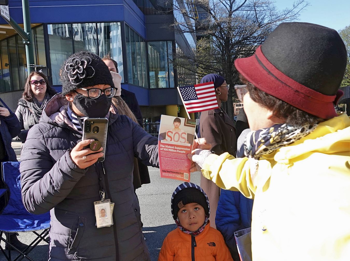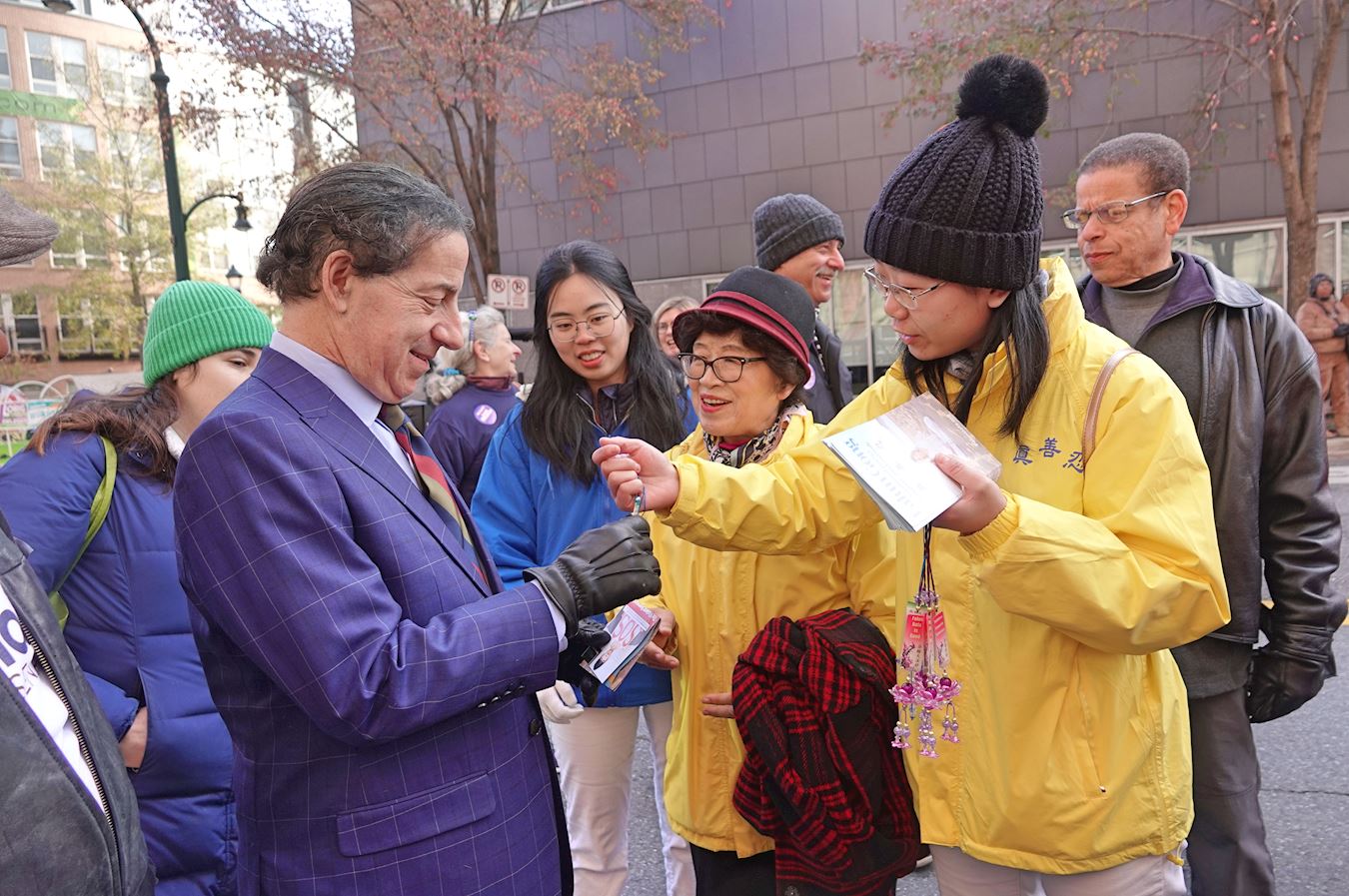 ![]() 图11:法轮功学员向马里兰州联邦众议员拉斯金(Jamie Raskin)递上法轮大法简介传单,并赠送莲花。 |
