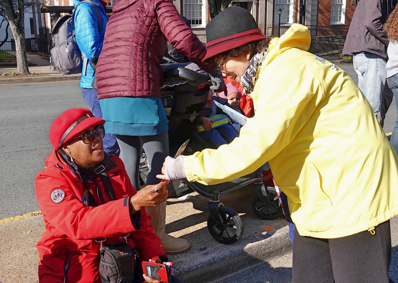 代表马里兰州的美国联邦参议员、众议员和当地政要也参加了当天的游行。法轮功学员向他们介绍了法轮大法,并赠送莲花。