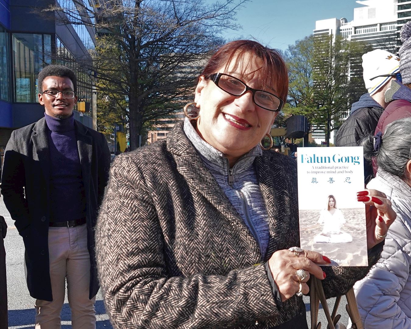 来自纽约的女士詹妮斯(Jenis Saffiogi)说,她从来没见过法轮功。“太美了,看到法轮功的游行队伍对我来说是一次美好的经历。”她说回纽约后,会查询有关法轮大法的更多信息。