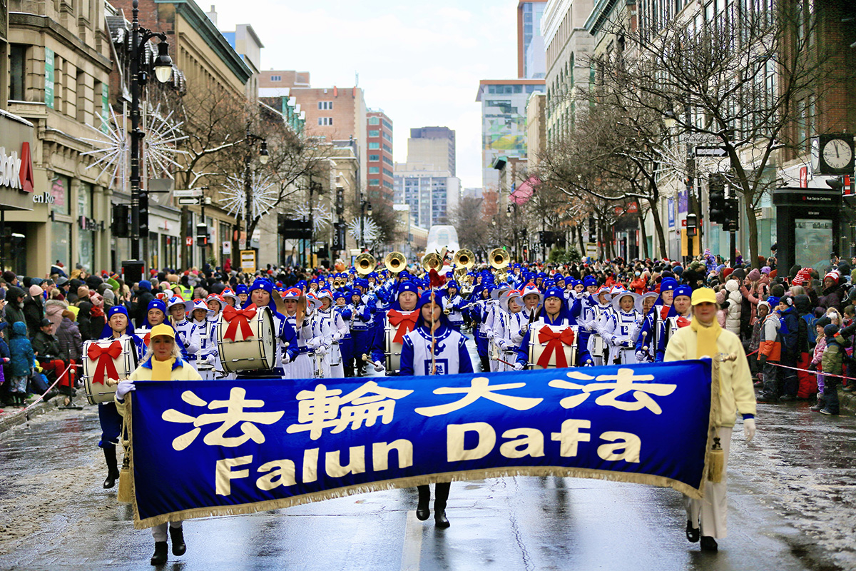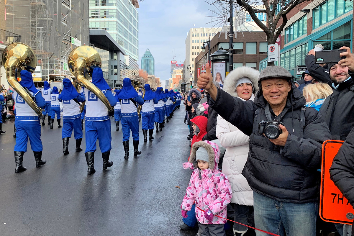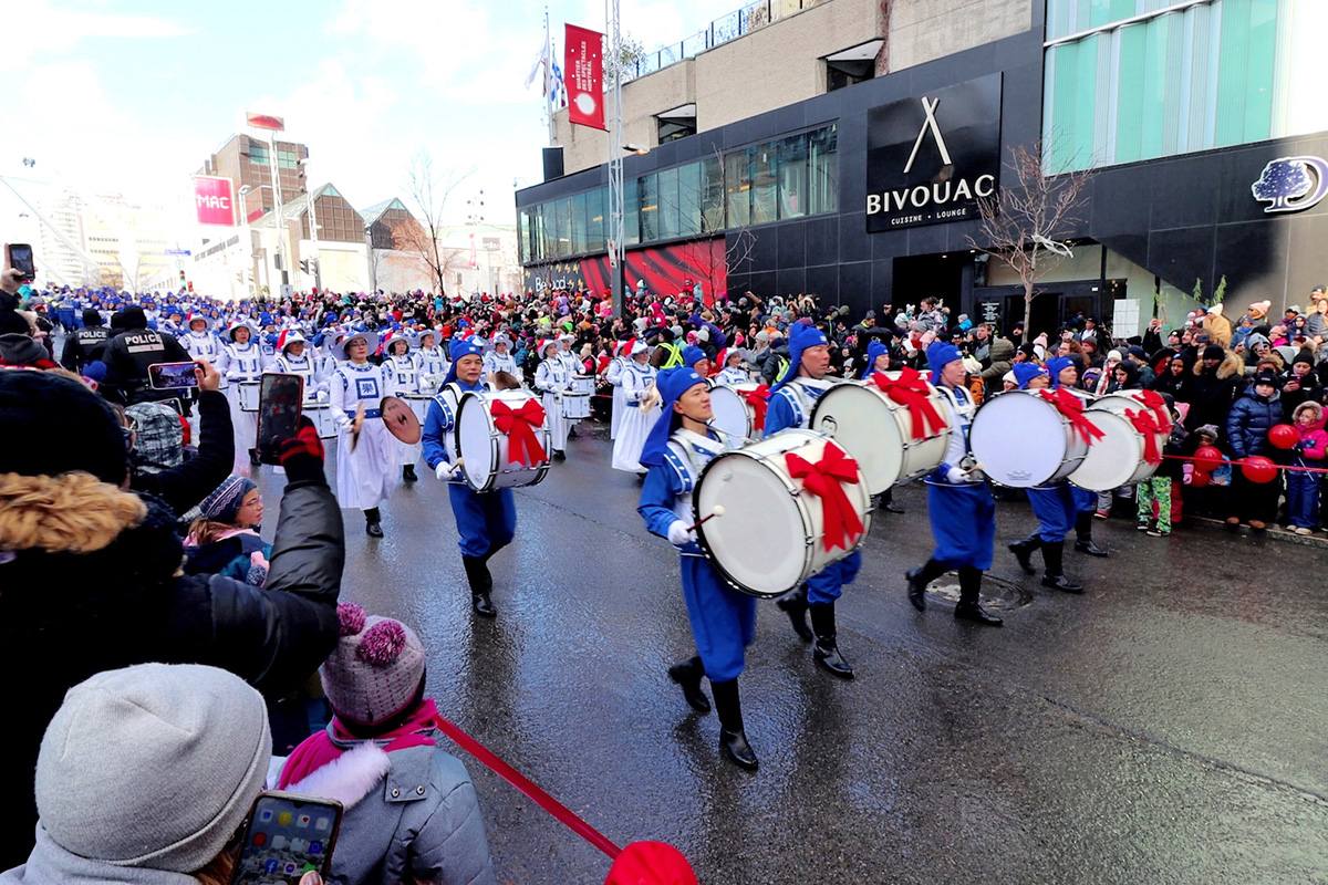 来自蒙特利尔、安大略省以及美国纽约的法轮功学员们,组成的法轮大法天国乐团队伍,是本次游行中阵容最庞大的队伍。他们为观众演奏了丰富多彩的曲目,包括充满节日欢乐的《铃儿响叮当》,还有《法轮大法好》、《神圣的歌》、《凯旋》,以及《法鼓法号震十方》等。沿途观众时不时报以”Bravo、Bravao (太棒了)”的欢呼和掌声。