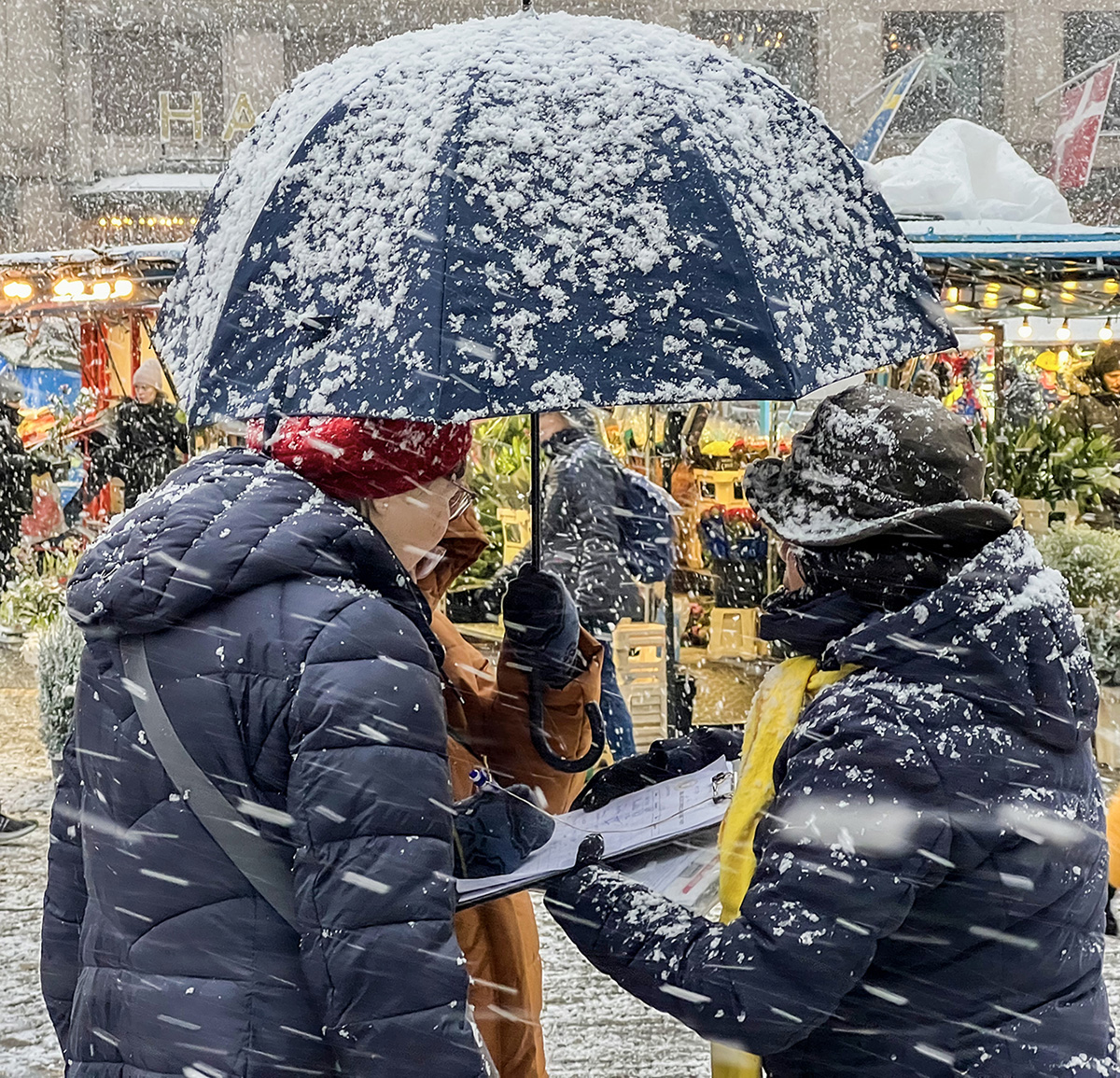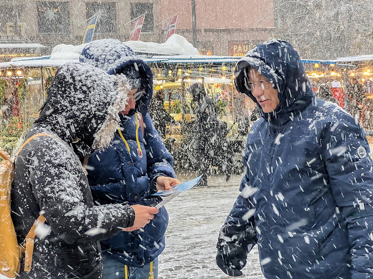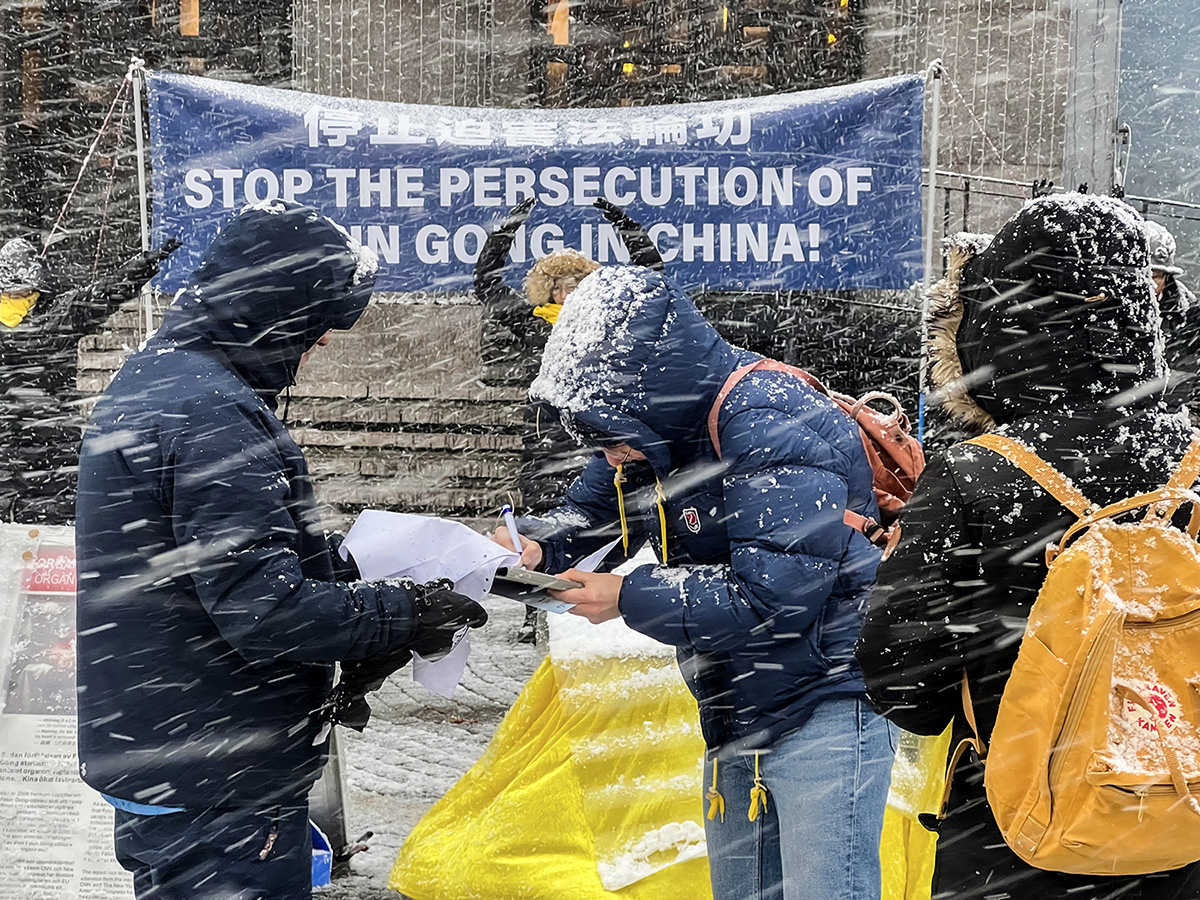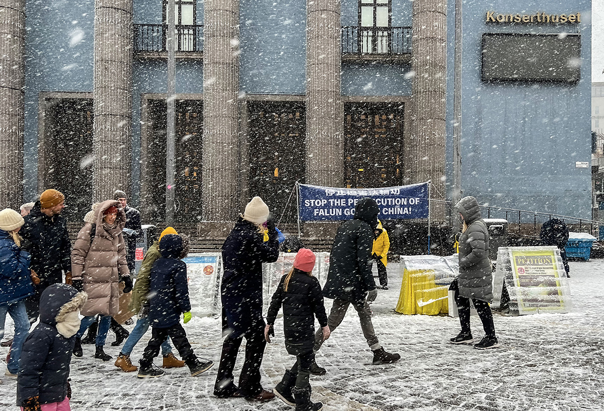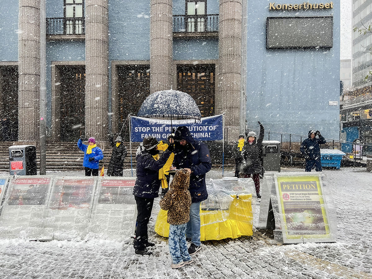 ![]() 图1:二零二二年十一月十九日,瑞典学员顶风冒雪在斯德哥尔摩音乐厅旁举办的讲真相活动,吸引了过往路人关注的目光。 |