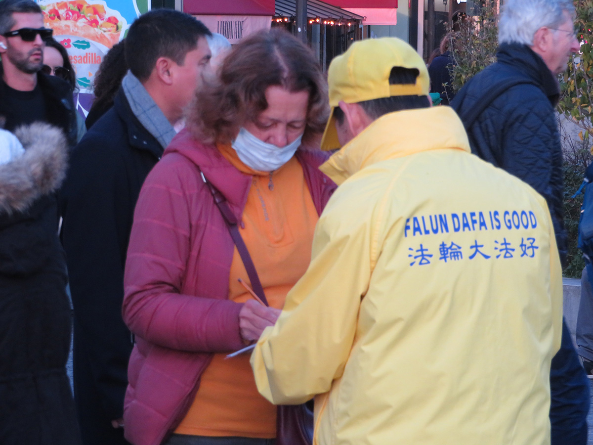 法轮功活动地点正好在步行街十字路口,人流来往不断。很多人都停下脚步,了解真相、签字。中共对法轮功学员的迫害令人发指,有的人流下了眼泪,有的人想捐款帮助法轮功学员。还有些年轻人当场与法轮功学员一起打坐。人们都想尽力支持法轮功制止迫害。