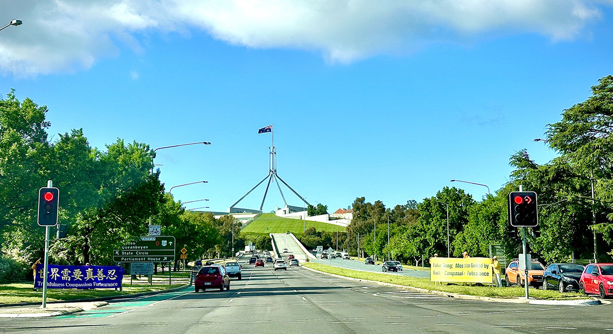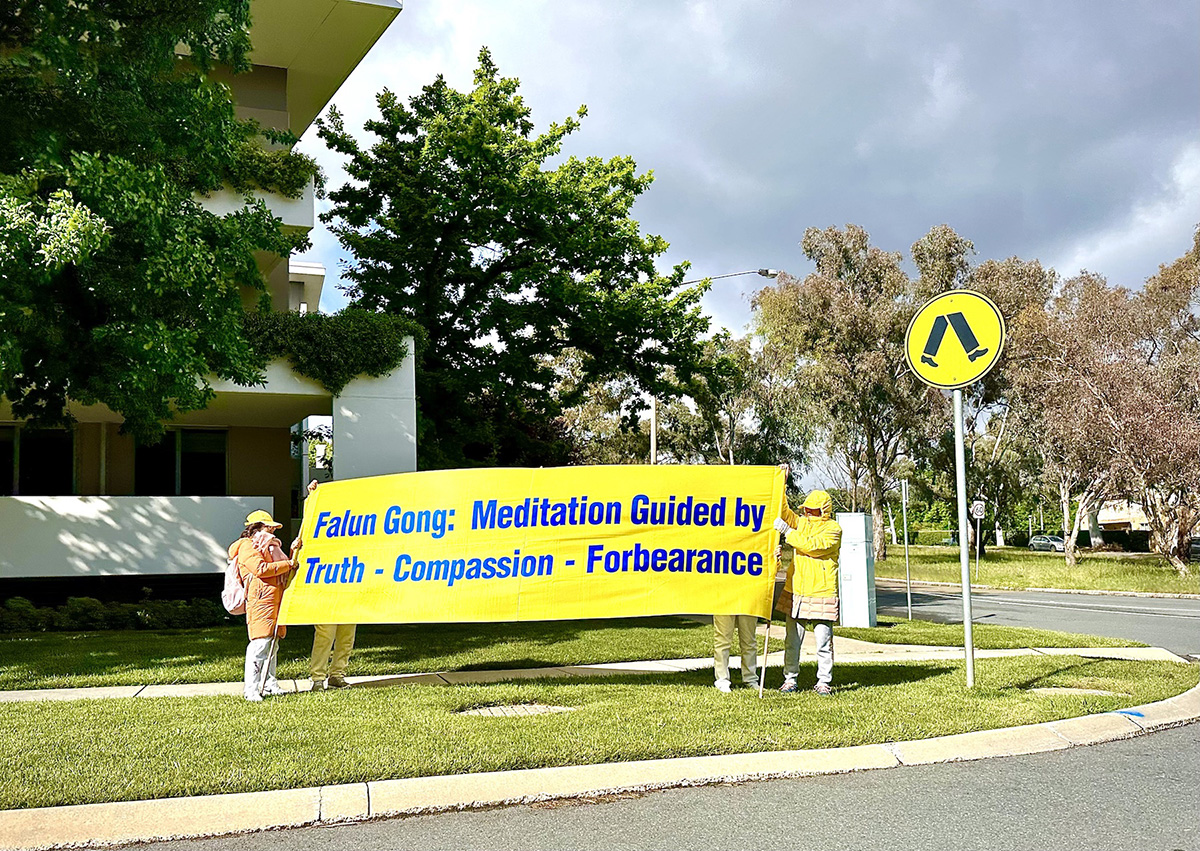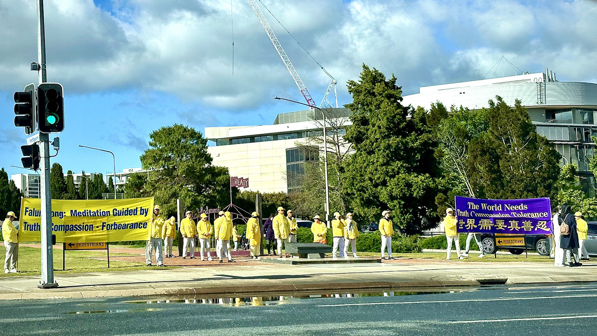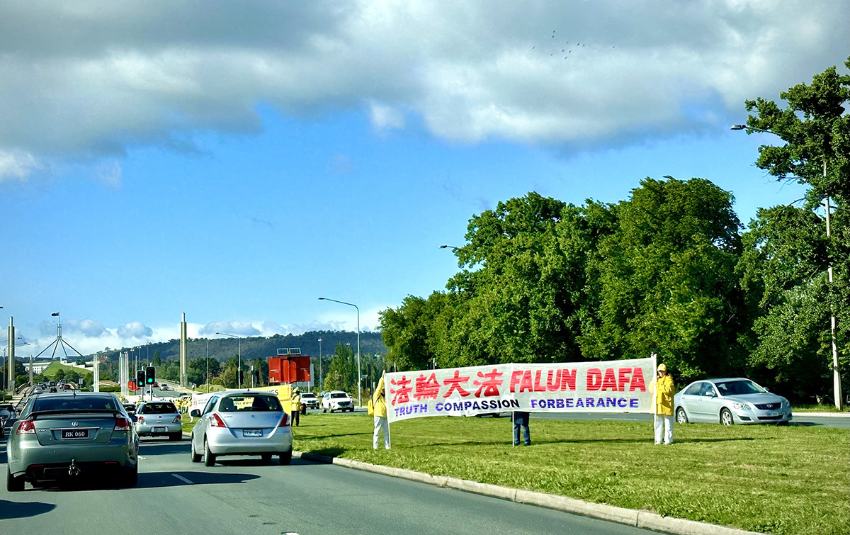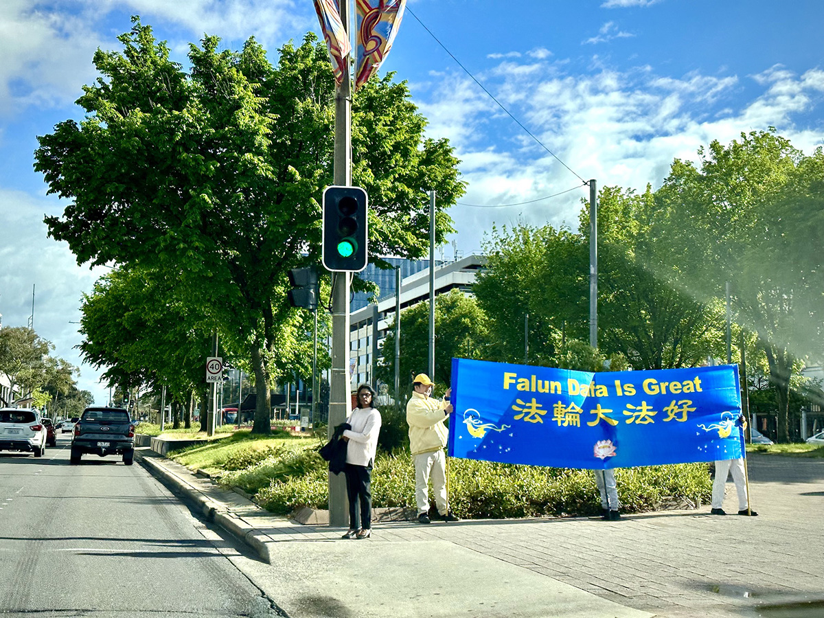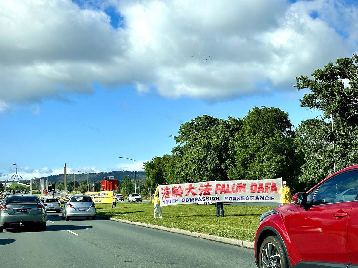 ![]() 图4~10:二零二二年十一月二十一至二十三日,在通往在澳洲首都国会大厦的要道上,法轮功学员向上、下班高峰时段的人们,展示真相横幅和祥和的法轮功五套功法,并讲述迫害真相。 |