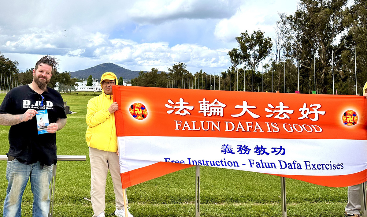 堪培拉居民亚历克斯(Alex)路过这里,与一位法轮功学员谈起迫害。他说,他知道法轮功,“法轮功所倡导的真、善、忍,中共正是与其相悖的。”