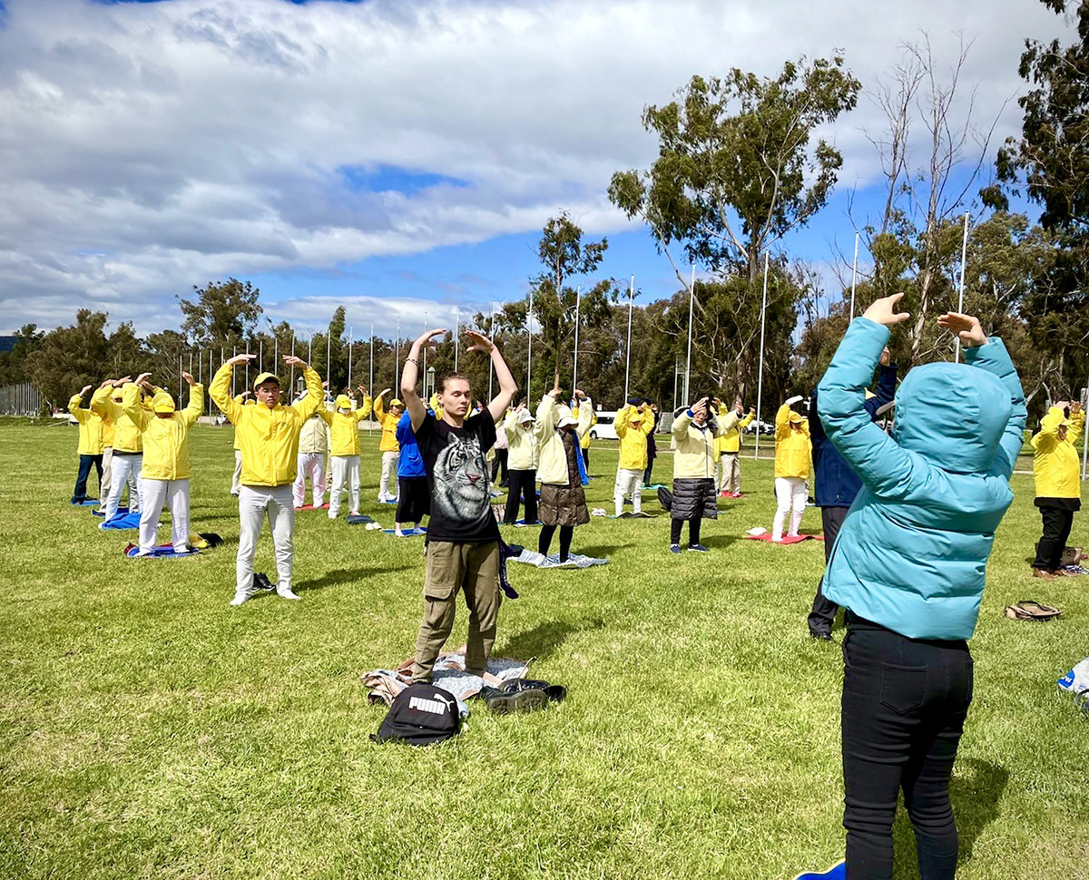 法轮功学员向肖姆展示了法轮功功法,他在学炼后表示感觉很好,很祥和,感受到与正能量接通。他表示会与周围的人分享这种体验。他还会回去查寻更多有关法轮功的资料,希望了解更多真相。