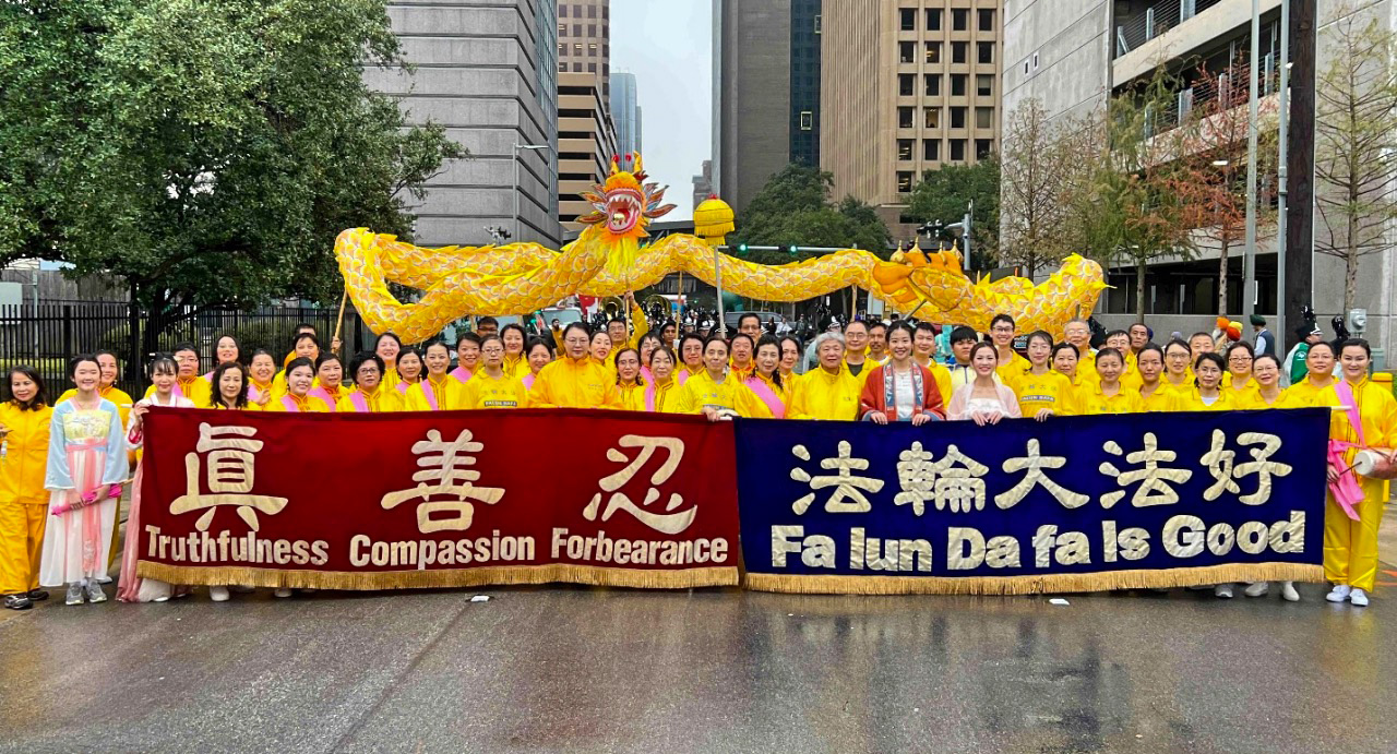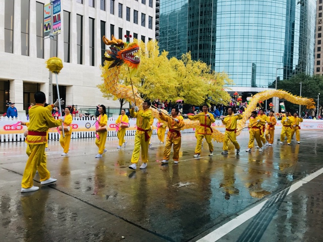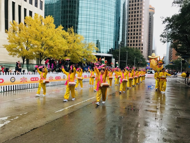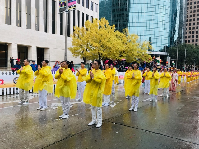 法轮功学员的队伍是参加本次游行的唯一亚裔社团。游行队伍,由镶着金色的“法轮大法好”和“真善忍”中英文的大横幅开道;随后是炼功队一边行进一边展示祥和法轮功功法;其后是腰鼓队,腰鼓队队员在法轮大法好的歌声中敲着有节奏的鼓点,精神抖擞前行;队伍最后是舞龙队压阵,一条黄色巨龙时而上下翻飞、时而盘旋起伏……法轮功学员的队伍受到了两旁观众的热烈欢呼。