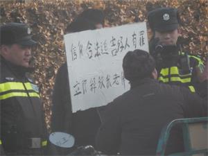 二零零八年七月,三河国保和六一零为了绑架王占青,在北京跟踪了他一个多月。之后,他被三河及北京中关村双榆树派出所警察联合绑架,把他工作的地方翻的乱七八糟,他工作用的电脑被抄抢。他被劫持到双榆树派出所,包中的几百元钱和MP4被抢走。警察强行给他按手纹和拍照,逼他说出住哪,打了他好几个耳光,背铐他一夜,还强迫他用信用卡取钱做体检费,把他投进看守所。在海淀区清河看守所,他被迫绝食抗议,几天后警察强行给他灌食,他拒绝配合,没有灌进去。第二天他被拉到海淀区的苏家坨拘留所,他继续绝食抗议,两天后,拘留所警察把他拉到999急救中心,继续对他迫害。他的脚上被铐上了沉重的脚镣,四肢被铐在床上呈大字形,插上导尿管,对他强行灌食、输液和抽血。他数次拔掉插进胃里的管子,拒绝灌食,不让抽血,他的上衣都是血。