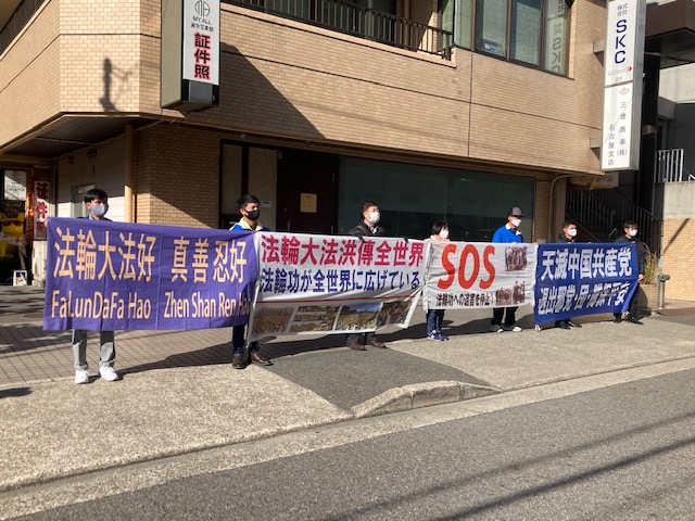 法轮功学员们在中国驻名古屋总领事馆前,打出了“法轮大法好 真善忍好”、“法轮大法洪传全世界”、“SOS停止迫害法轮功”及“天灭中国共产党 退出邪*党-团队保平安”的中日文横幅。