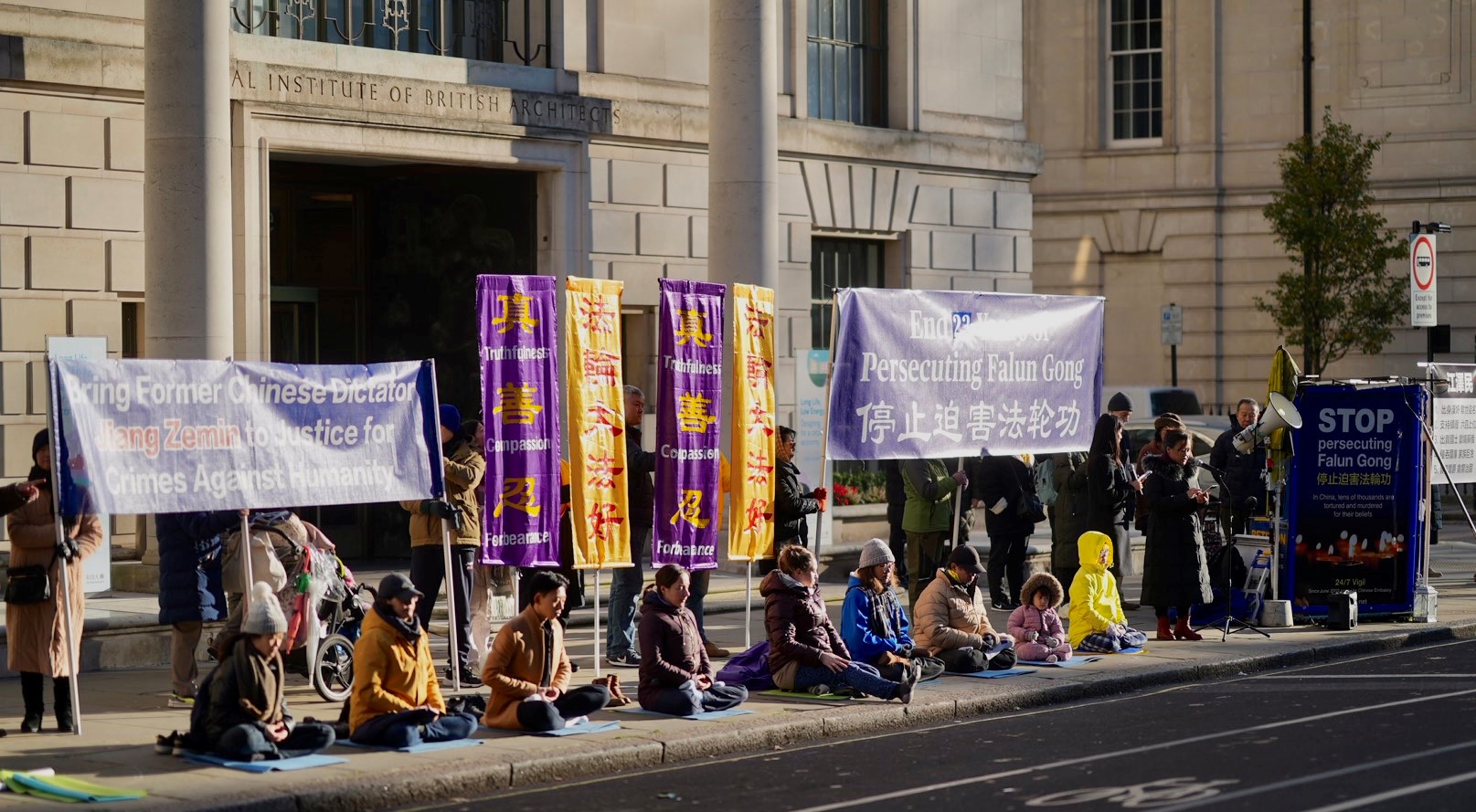 当天上午十一点,法轮功学员伴随炼功音乐展示功法,学员们拉起中英文横幅表达诉求:“法轮大法好”,“真善忍”,“停止迫害轮功”,“江泽民十大罪状”和“控诉前中国独裁者江泽民反人类罪”。