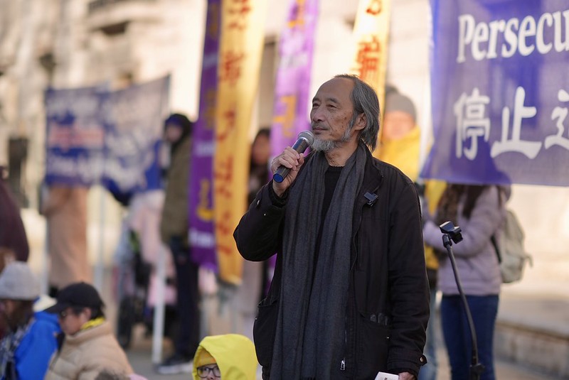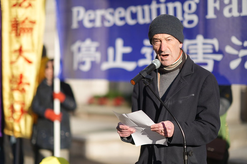 欧洲法轮功之友主席约翰·迪伊(John Dee)在集会上发言中说:指出:“自一九九九年七月以来,数千法轮功学员被折磨致死,数以百万计的法轮功学员深受残忍迫害的影响,其中包括肉体和精神上的折磨、暴力审讯以迫使他们放弃信仰、剥夺睡眠和最令人发指的活摘器官牟利罪行……”
