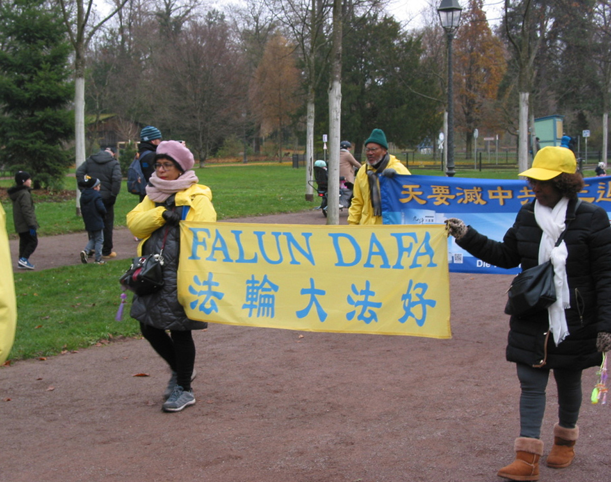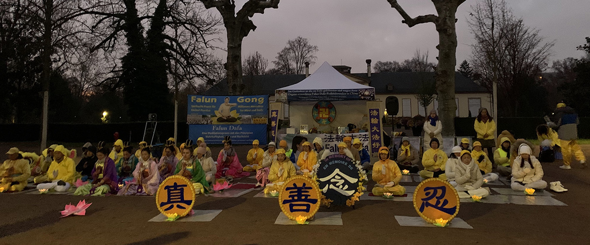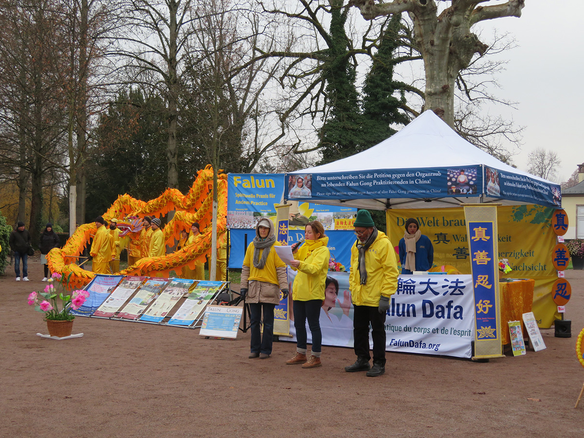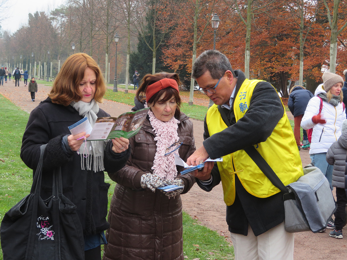 当地的橘树公园(Parc de l'Orangerie)是法轮功学员的炼功点。十二月十日和十一日两天,法轮功学员进行了游行、功法展示和烛光悼念活动。周末人们到公园锻炼、散步歇息,遇见法轮功分外欣喜。他们比去圣诞市场的人更有时间和耐心,认真倾听、了解真相。
