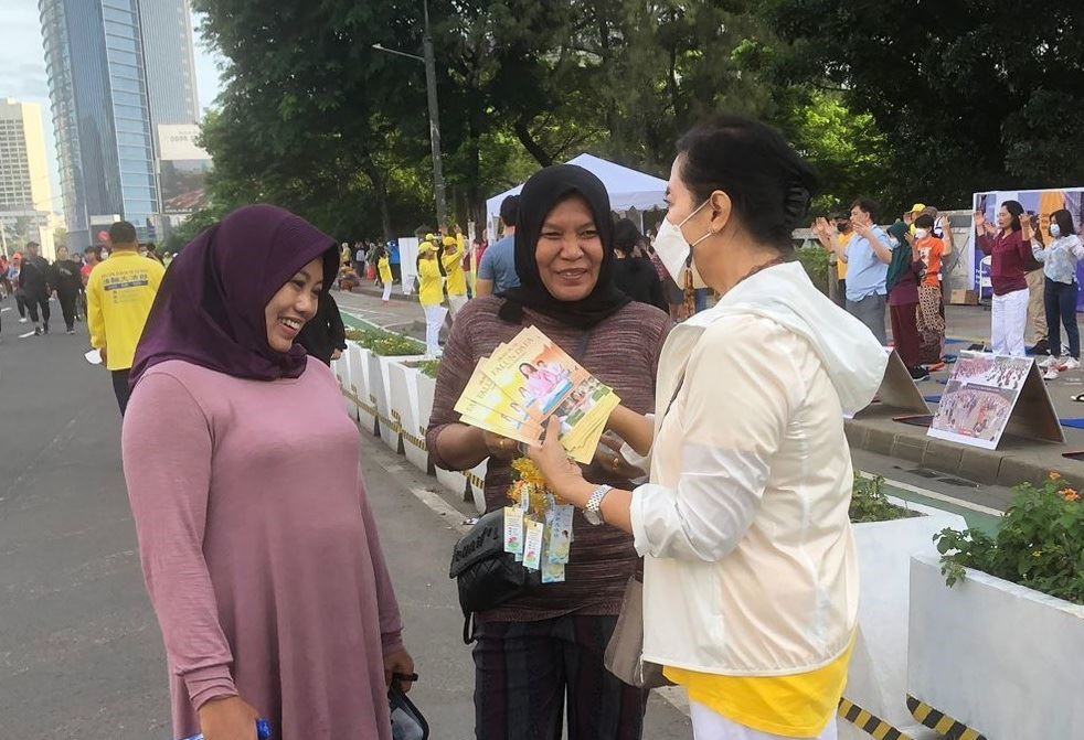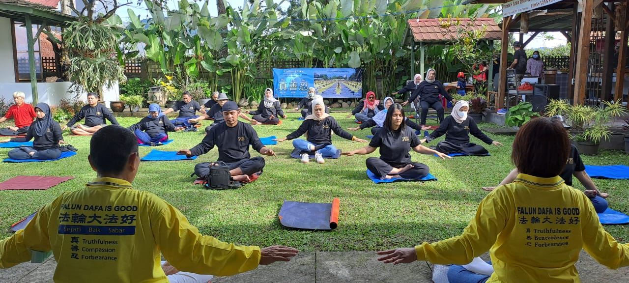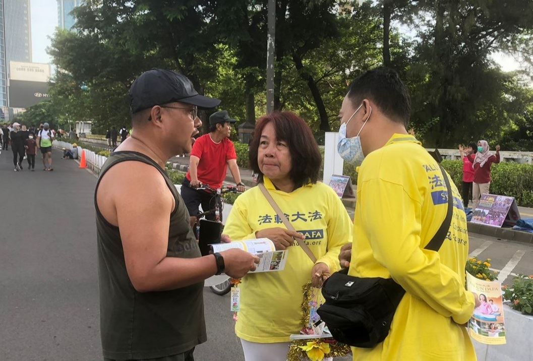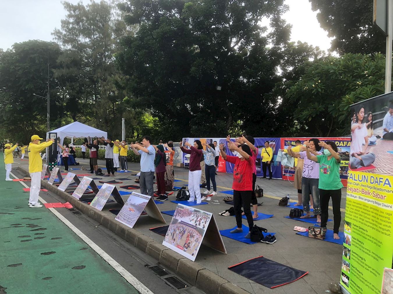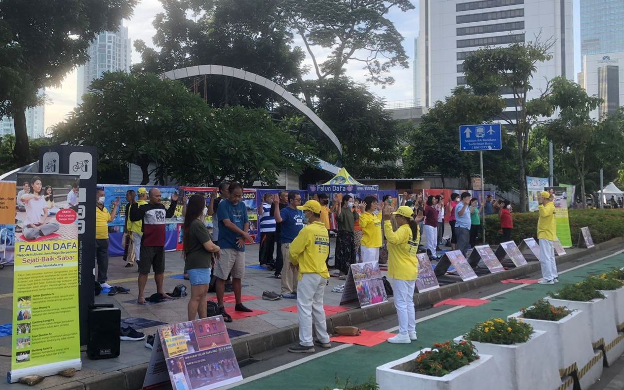 十二月十一日星期天早上,在雅加达的无车日(Car Free Day),法轮功学员再度在首都的商务区举办集体炼功活动。许多在那里晨练的市民很感兴趣,跟着学起了五套功法。