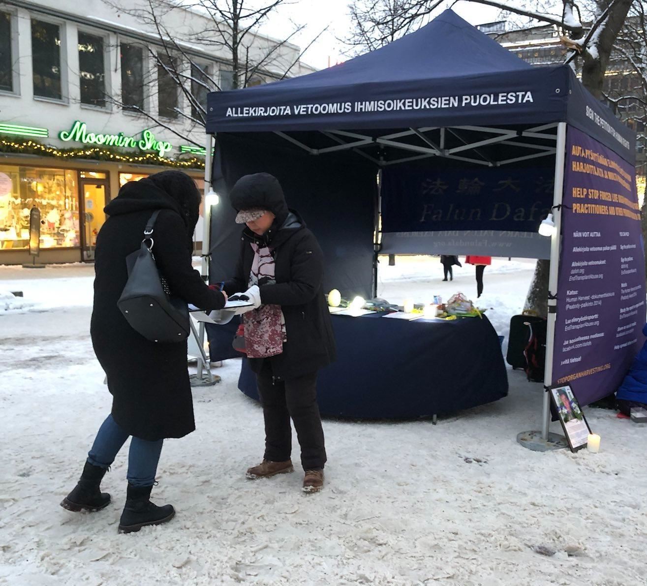 ![]() 图3:芬兰法轮功学员在首都赫尔辛基市中心,路人签名支持法轮功反迫害。 |