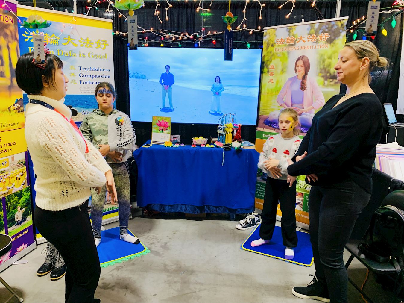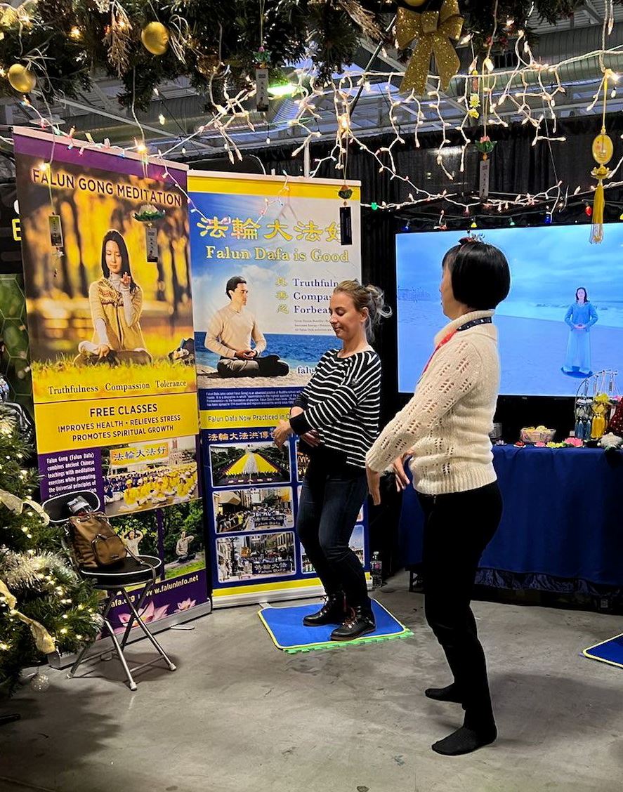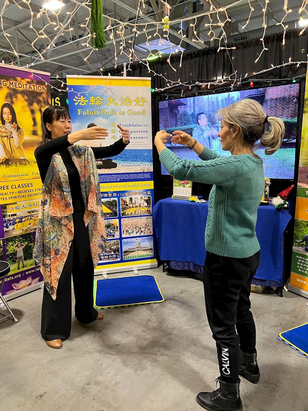 有名灯展的工作人员多次经过法轮大法的展位,每一次都忍不住朝着展位方向看。学员教瑞金炼功时,她也跟着认真地学了起来。旁边的学员上前从头开始教她第一套功法的炼功动作。还没有炼完,她就感觉到手发热了。她问,“这套功法叫什么名字?”学员告诉她是佛展千手法。学员还告诉她,法轮功要求炼功人要有一颗发自内心的善良之心,面部也要祥和、放松。她说,“那会改变我的面相,我的皱纹会消失。”
