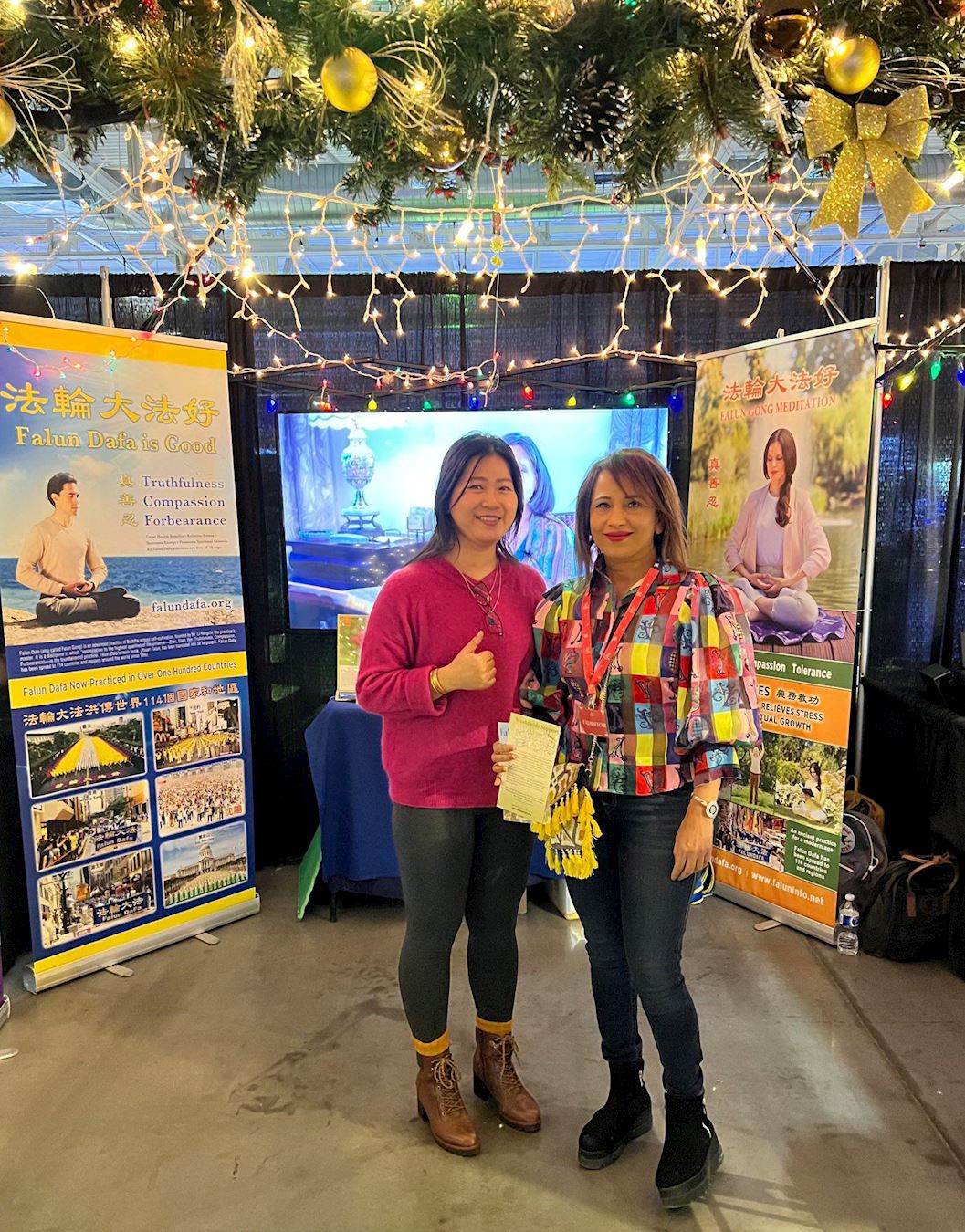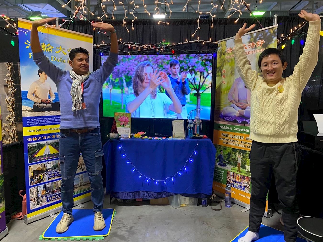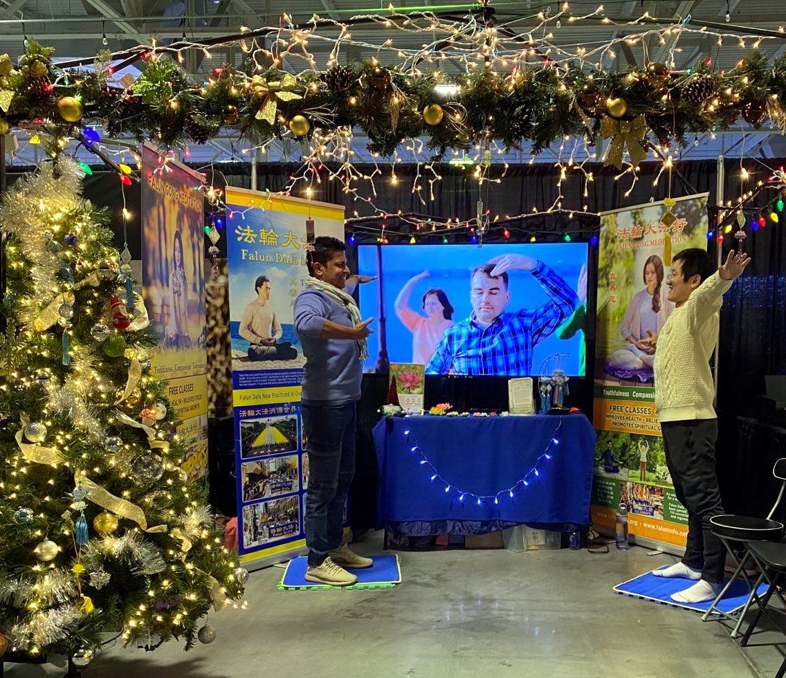 有名灯展的工作人员多次经过法轮大法的展位,每一次都忍不住朝着展位方向看。学员教瑞金炼功时,她也跟着认真地学了起来。旁边的学员上前从头开始教她第一套功法的炼功动作。还没有炼完,她就感觉到手发热了。她问,“这套功法叫什么名字?”学员告诉她是佛展千手法。学员还告诉她,法轮功要求炼功人要有一颗发自内心的善良之心,面部也要祥和、放松。她说,“那会改变我的面相,我的皱纹会消失。”