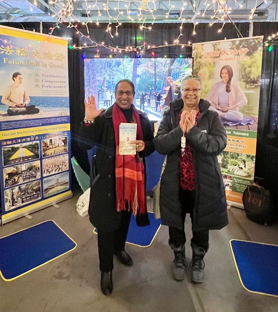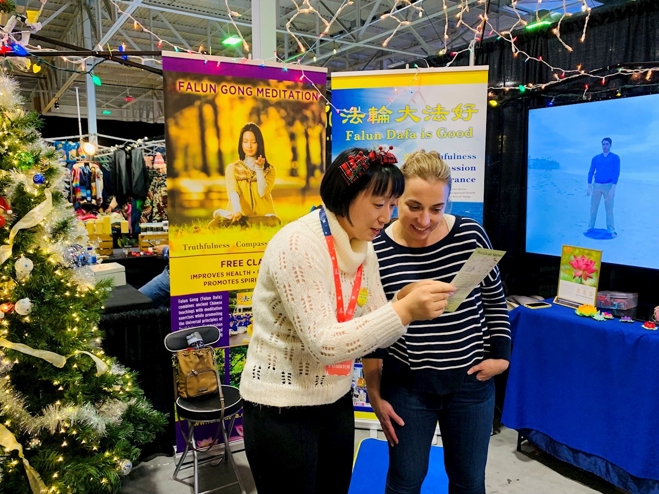 法轮大法的展位位于一排弯弯月牙形状的发光变色秋千对面。瑞金(Regine)的女儿在秋千上玩耍。也许是女儿给了妈妈这个契机,让她来到了展位附近。瑞金主动上前跟学员交谈。她说:“我总能在多伦多唐人街看到法轮功的游行和集会,可我没深入了解过。”她对法轮功感到很好奇,想要知道法轮功到底是什么,所以问了很多问题,包括为什么法轮功在中国是被禁止的?