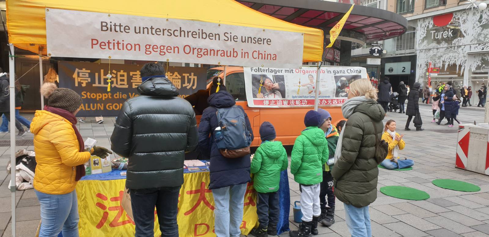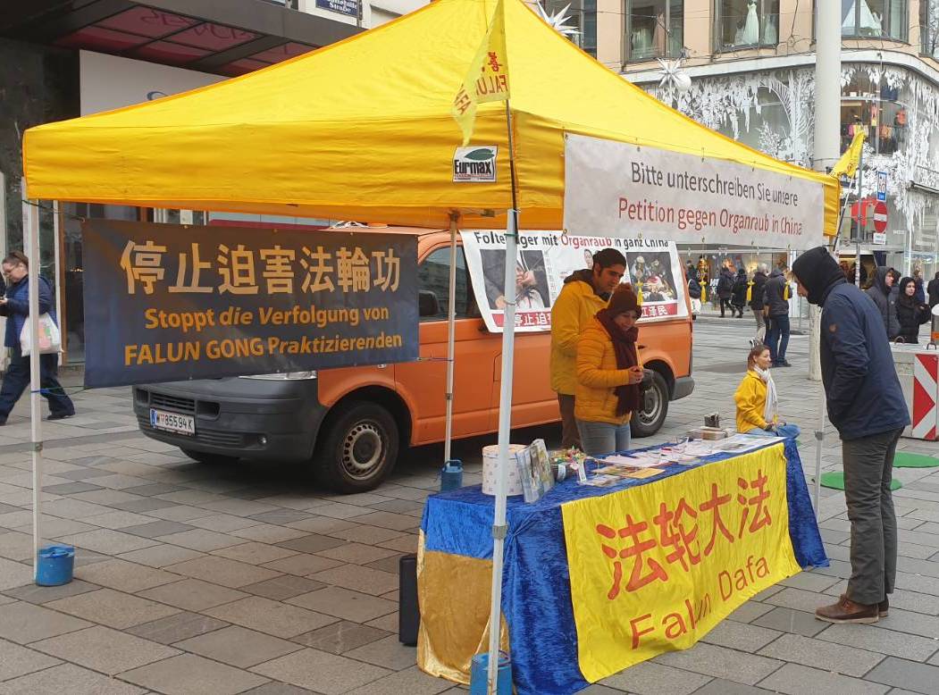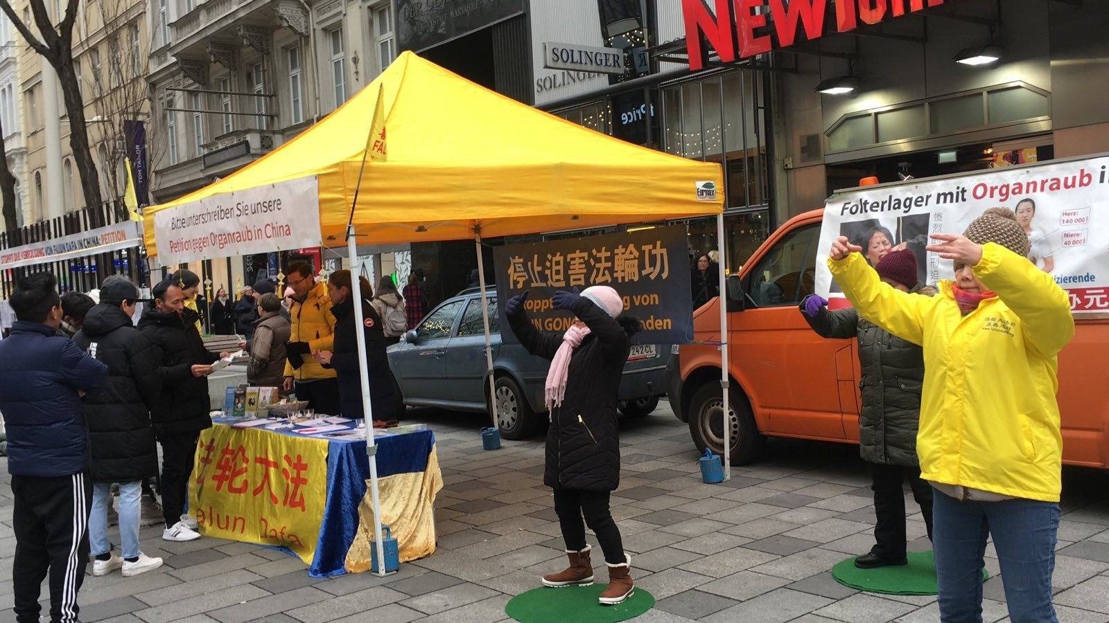 十二月八日,在繁华的维也纳玛利亚希尔夫大街 (Mariahilfer Straße)上,很多路人在进行圣诞节采购的时候都注意到了法轮功的真相信息台。一整天里,法轮功学员们展示了祥和的五套功法。很多人带着兴趣走近,他们对展板上在中国发生的酷刑以及活摘器官的图片感到非常震撼,纷纷签字支持反迫害。