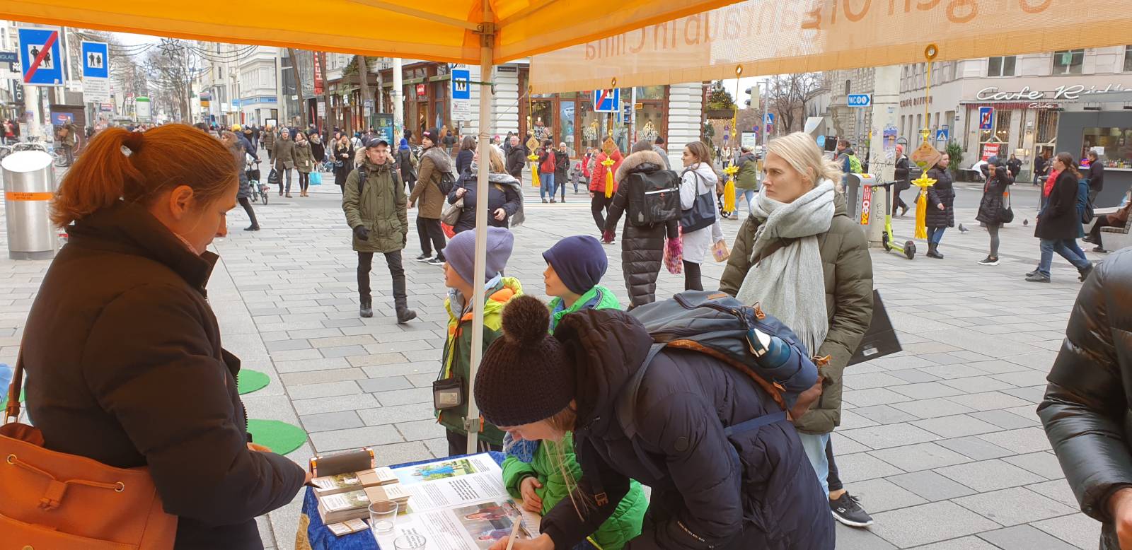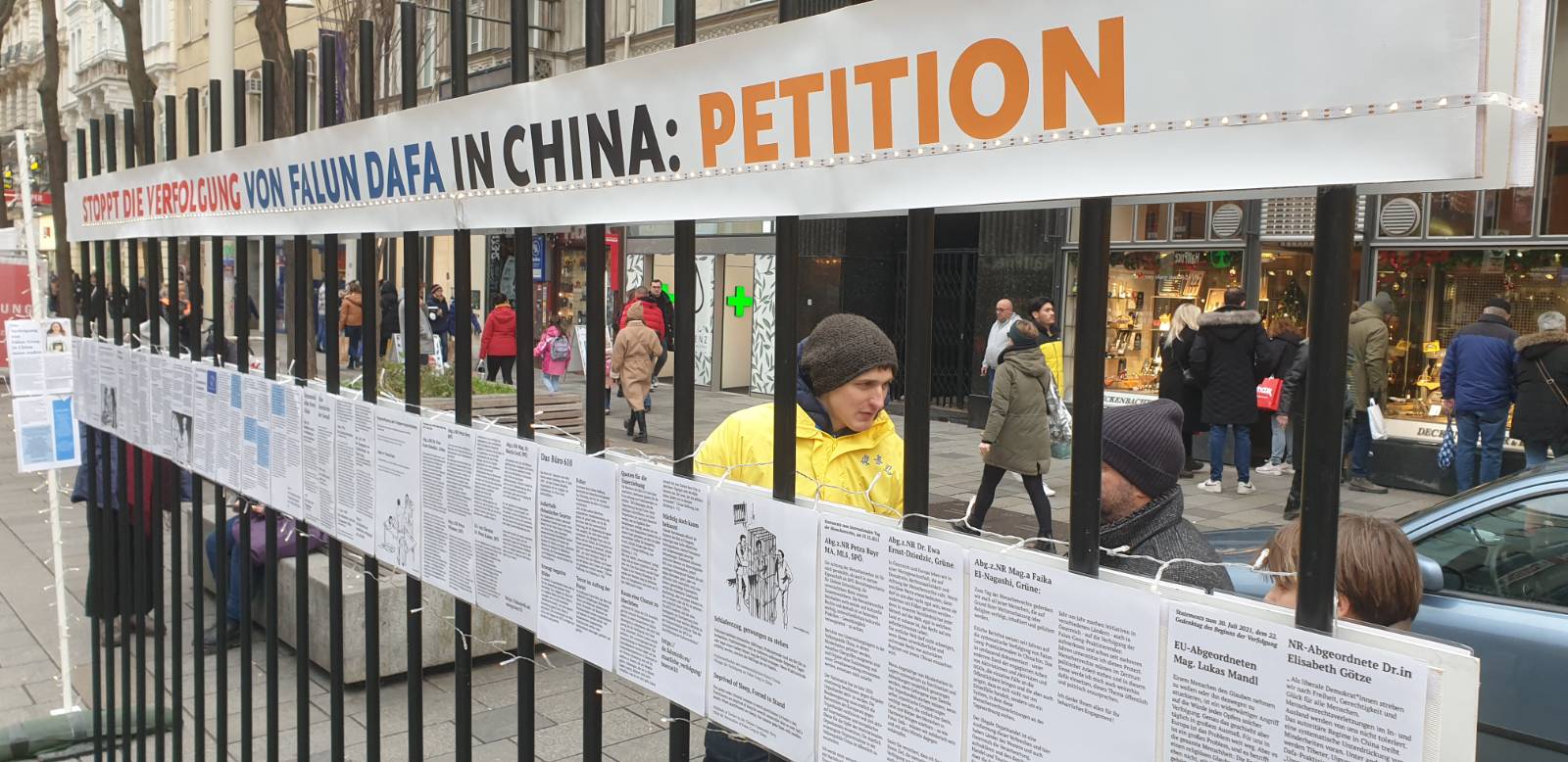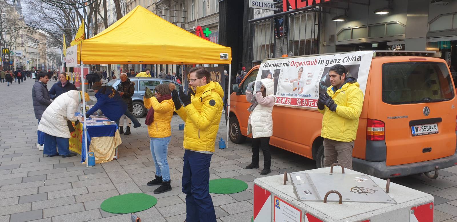 十二月八日,在繁华的维也纳玛利亚希尔夫大街 (Mariahilfer Straße)上,很多路人在进行圣诞节采购的时候都注意到了法轮功的真相信息台。一整天里,法轮功学员们展示了祥和的五套功法。很多人带着兴趣走近,他们对展板上在中国发生的酷刑以及活摘器官的图片感到非常震撼,纷纷签字支持反迫害。