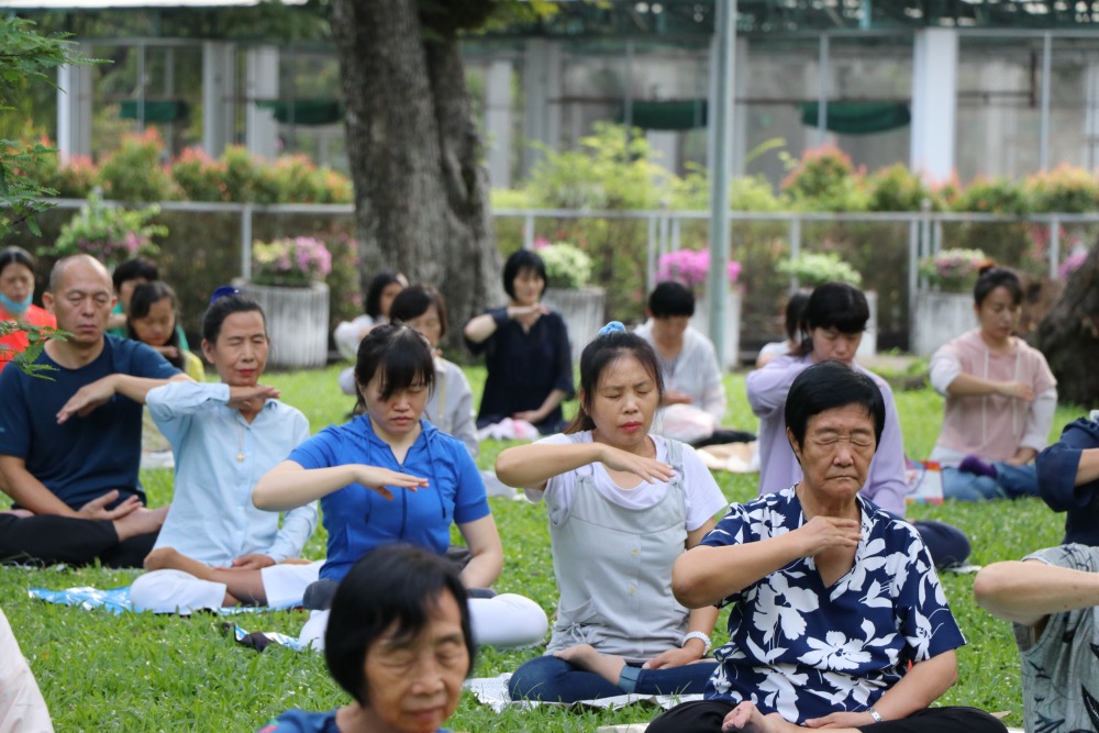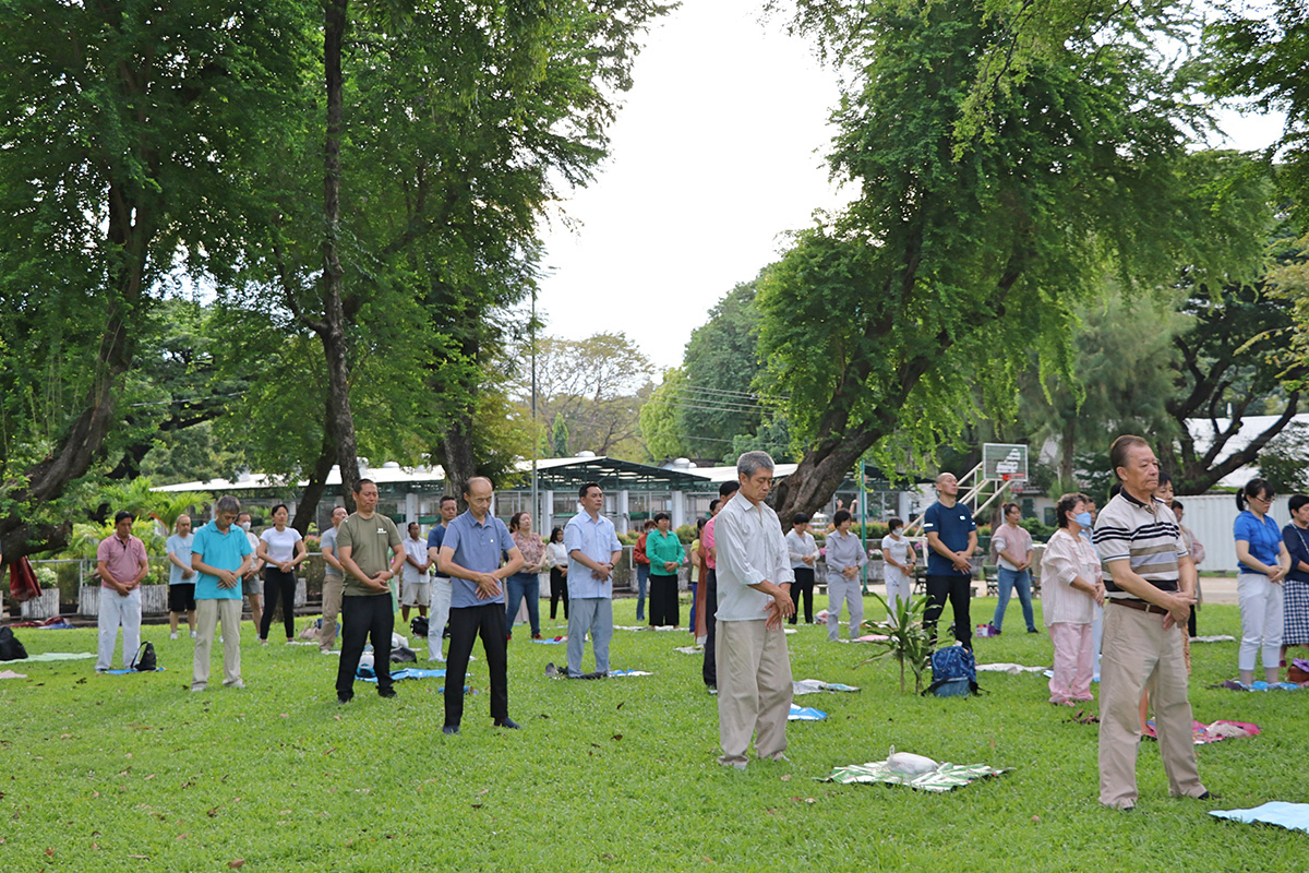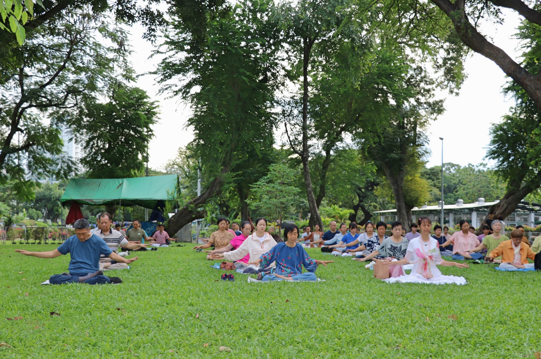 当天,曼谷是乐园(Lumphini Park)空气凉爽,环境安静。法轮功学员六点开始,伴着大法炼功音乐,在慈悲、祥和的能量场中,学员们集体炼功。