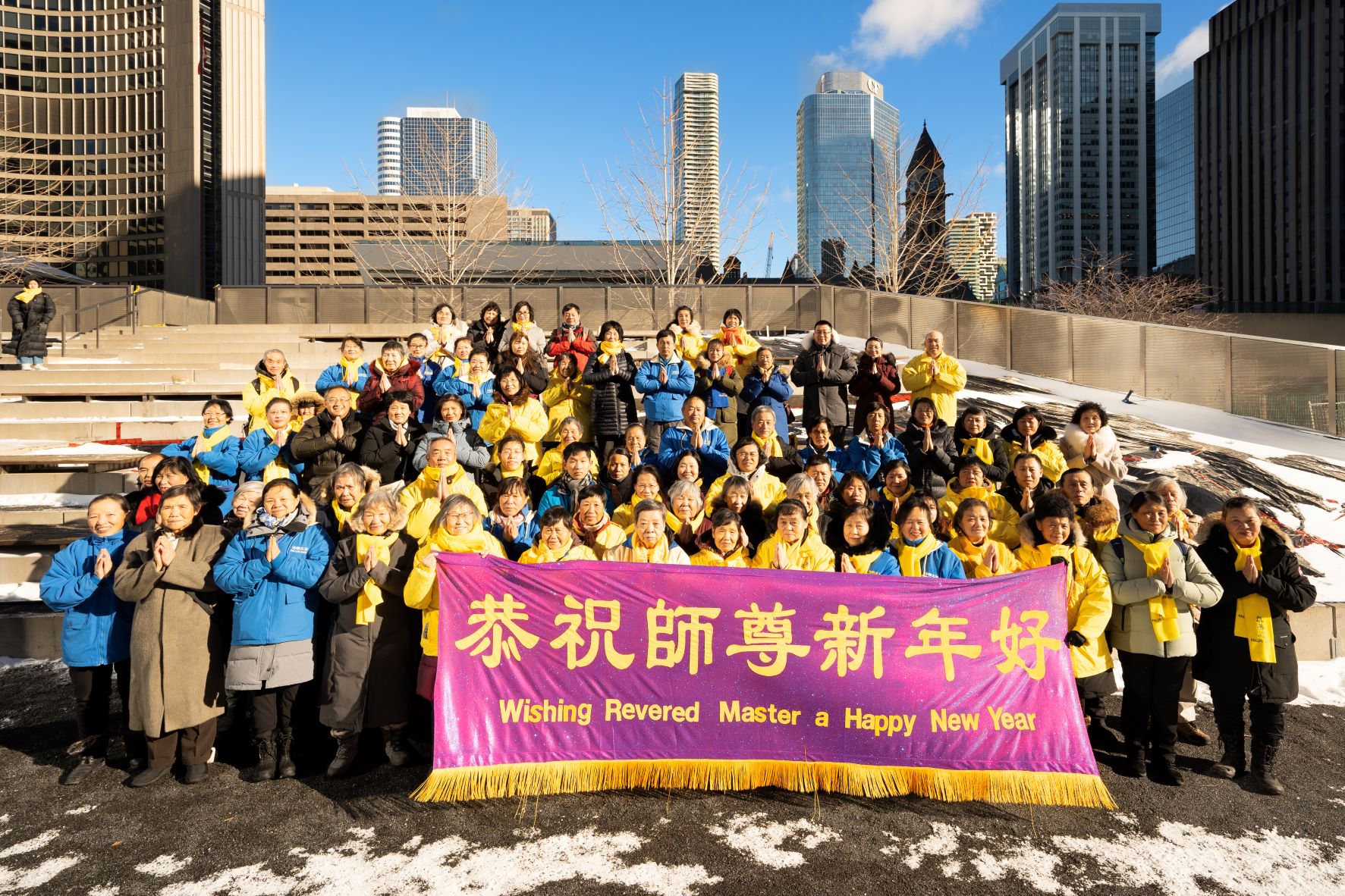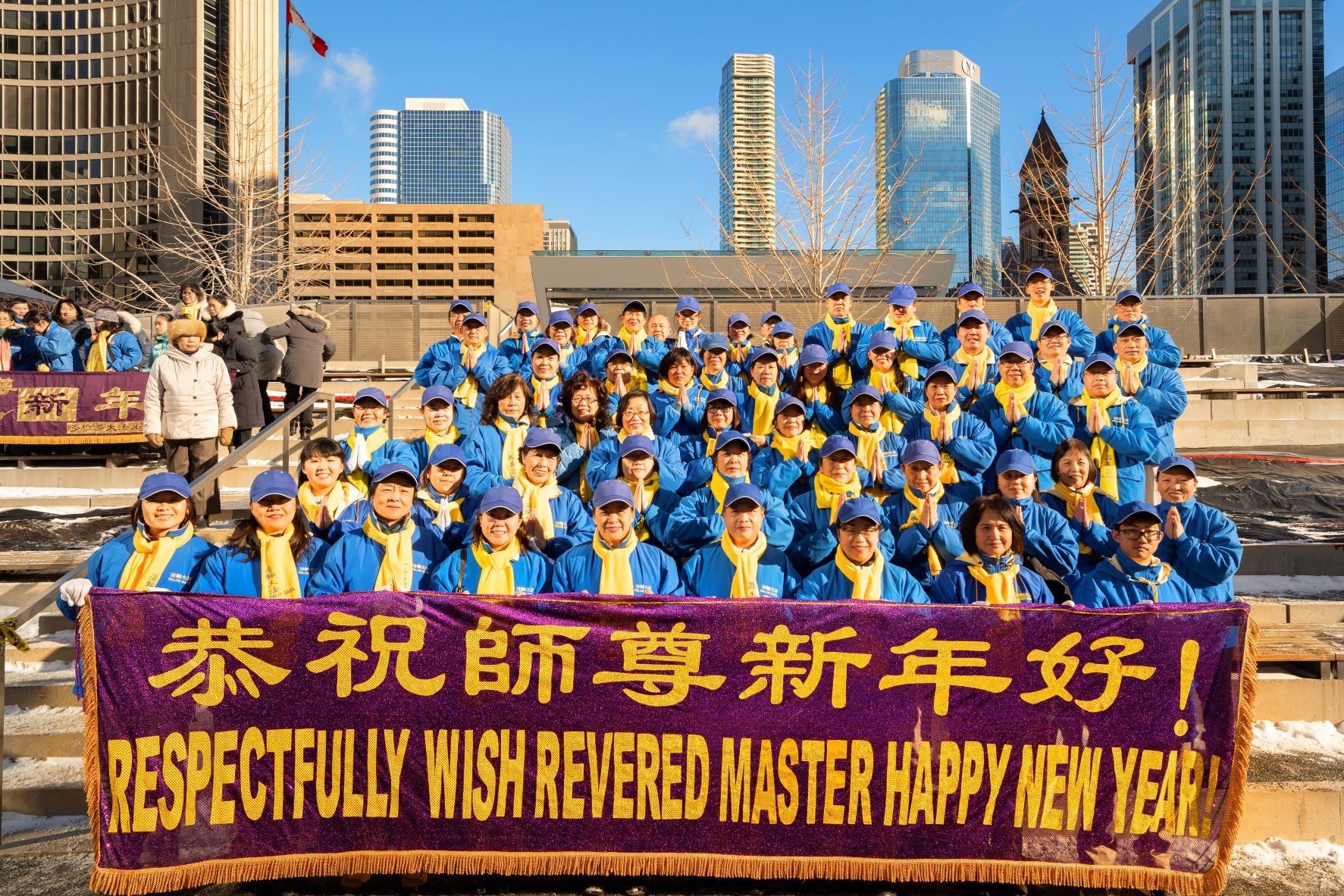 ![]() 图1:二零二二年十二月二十五日中午,多伦多大法弟子在市政厅广场给慈悲伟大的师父拜年,恭祝师父新年快乐! |