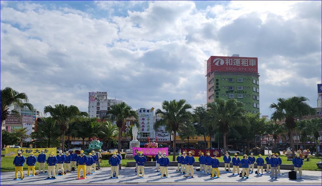 ![]() 图2:台湾花莲法轮功学员,在火车站前广场展示五套功法。 |