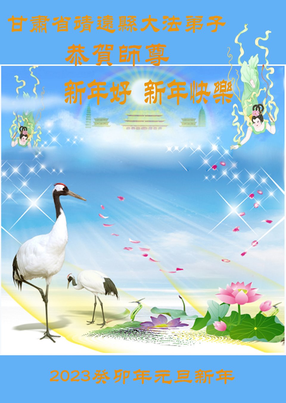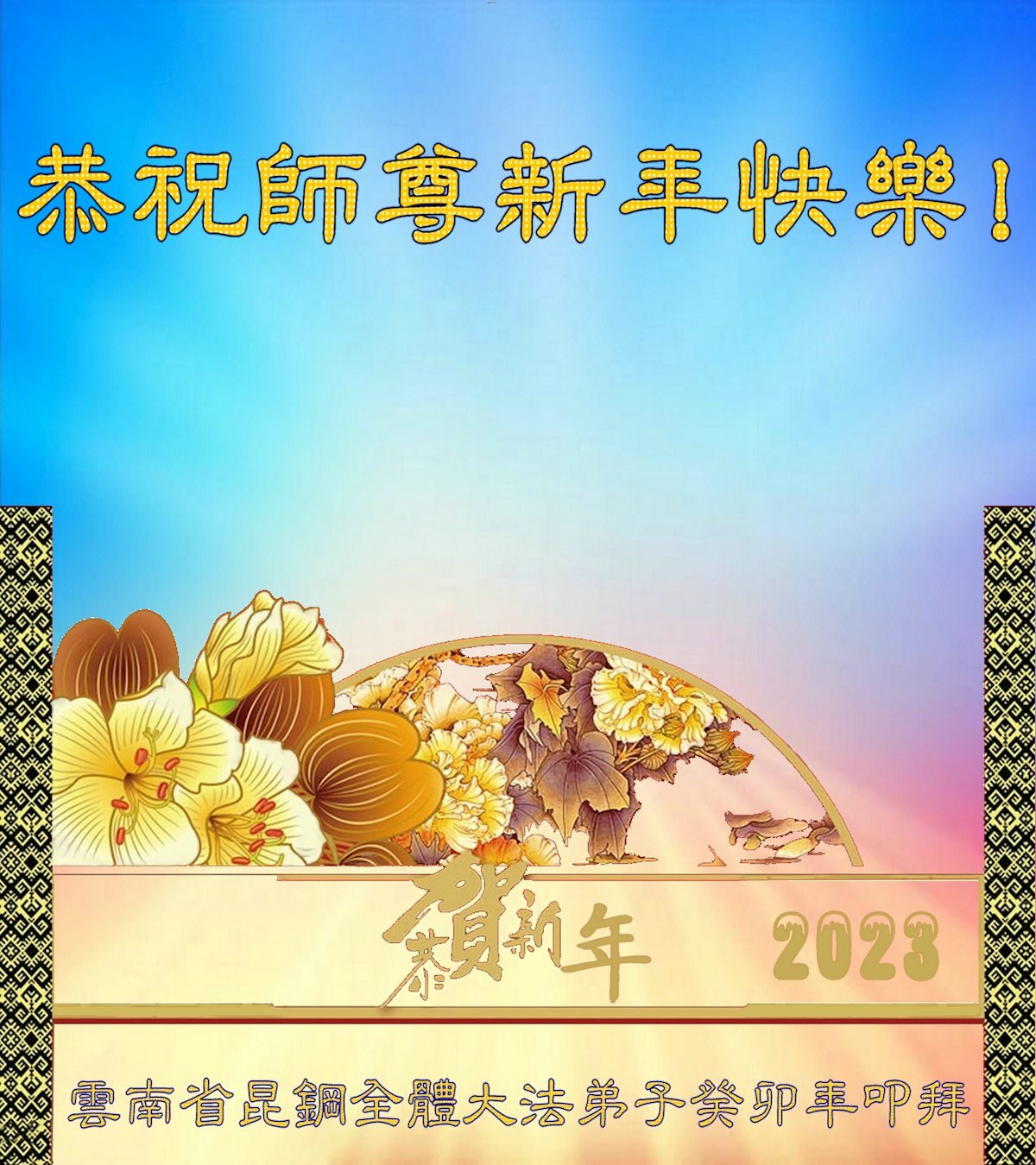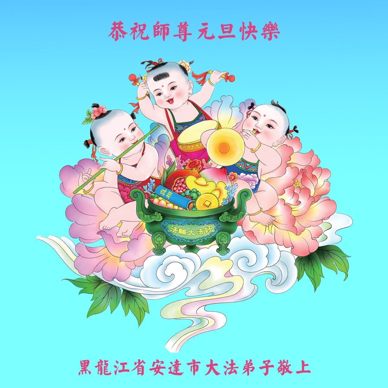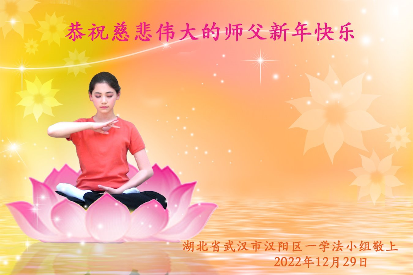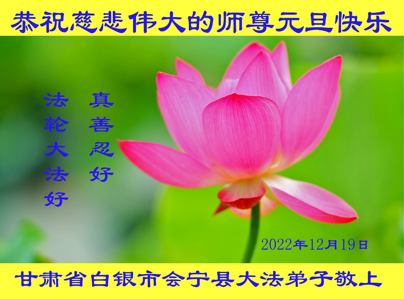 【明慧网二零二二年十二月三十一日】(明慧网通讯员综合报道)中国大陆的法轮功新学员感到万分幸运,在危机四伏的末劫之时得到法轮大法,感受到师尊无所不在的看护,体悟大法的洪恩浩荡。在2023年元旦来临之时,新学员们恭祝师父元旦快乐!